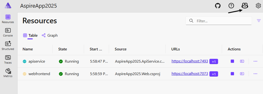 2) 启动项目,用Github account帐户登录VSCode(微软有提供免费的GitHub Copilot订阅),在.NET Aspire应用程序的dashboard右上角可以看到GitHub Copilot图标,如下图所示,