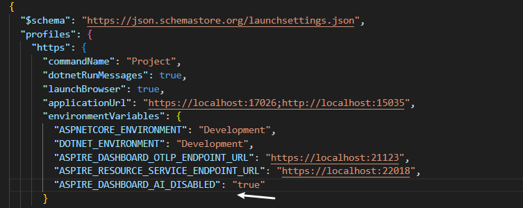 如果需要在Aspire Dashboard中禁用GitHub Copilot,则可以在AppHost项目的launchSettings.json文件中添加如下的配置即可,