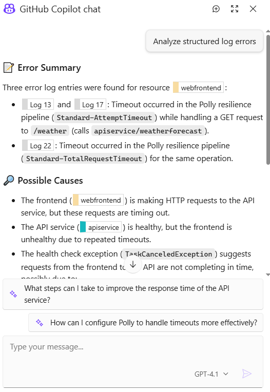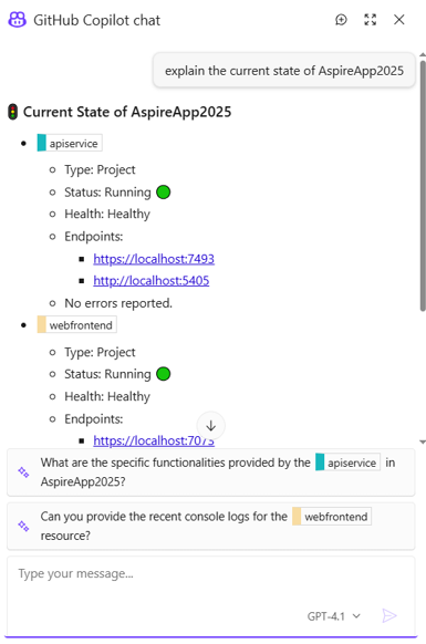 当前.NET Aspire的最新版本是9.5.2。从9.3版本开始, GitHub Copilot被整合到了Aspire Dashboard中,用于辅助用户进行.NET Aspire程序的debug。同时微软也将推出Aspire CLI,用户使用Aspire CLI可以更加便利地进行Aspire应用程序的创建和配置,Aspire CLI也可以使用一些Aspire项目初始模板。