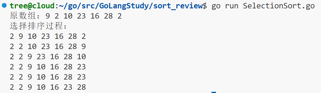 }func main() {nums := []int{9, 2, 10, 23, 16, 28, 2}fmt.Printf("原数组:")PrintNums(nums)fmt.Printf("选择排序过程:\n")for i := 0; i < len(nums)-1; i++ {minnum := ifor j := i; j < len(nums); j++ {if nums[minnum] > nums[j] {minnum = j}}temp := nums[i]nums[i] = nums[minnum]nums[minnum] = tempPrintNums(nums)}