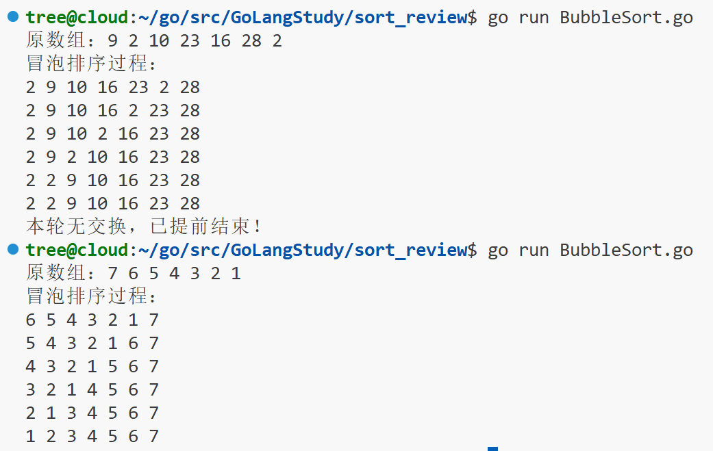 }func main() {// 冒泡排序nums := []int{9, 2, 10, 23, 16, 28, 2}fmt.Printf("原数组:")PrintNums(nums)fmt.Printf("冒泡排序过程:\n")for i := 0; i < len(nums)-1; i++ {flag := falsefor j := 0; j < len(nums)-i-1; j++ {if nums[j] > nums[j+1] {flag = truetemp := nums[j]nums[j] = nums[j+1]nums[j+1] = temp}}PrintNums(nums)if flag == false {fmt.Println("本轮无交换,已提前结束!")break}}