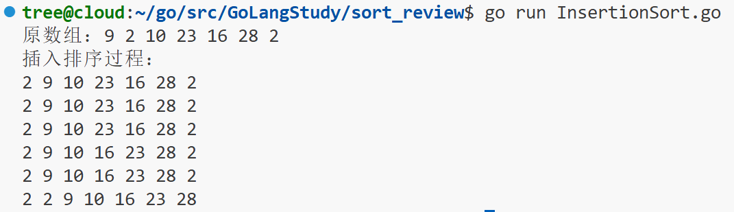 }func main() {nums := []int{9, 2, 10, 23, 16, 28, 2}fmt.Printf("原数组:")PrintNums(nums)fmt.Printf("插入排序过程:\n")for i := 0; i < len(nums)-1; i++ {for j := i + 1; j > 0; j-- {if nums[j] < nums[j-1] {temp := nums[j]nums[j] = nums[j-1]nums[j-1] = temp} else {break}}PrintNums(nums)}