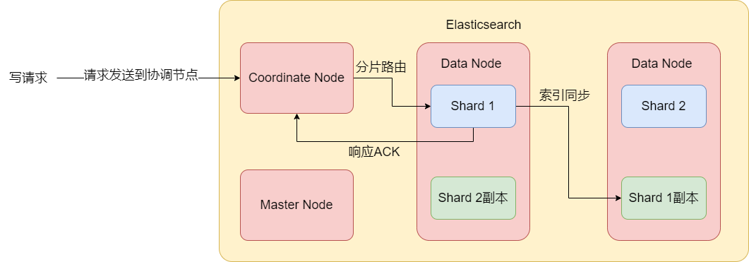 当需要写文档时,请求会先发送到协调节点,协调节点根据分片路由计算文档应该写入到哪个分片,并把文档发送到那个分片。