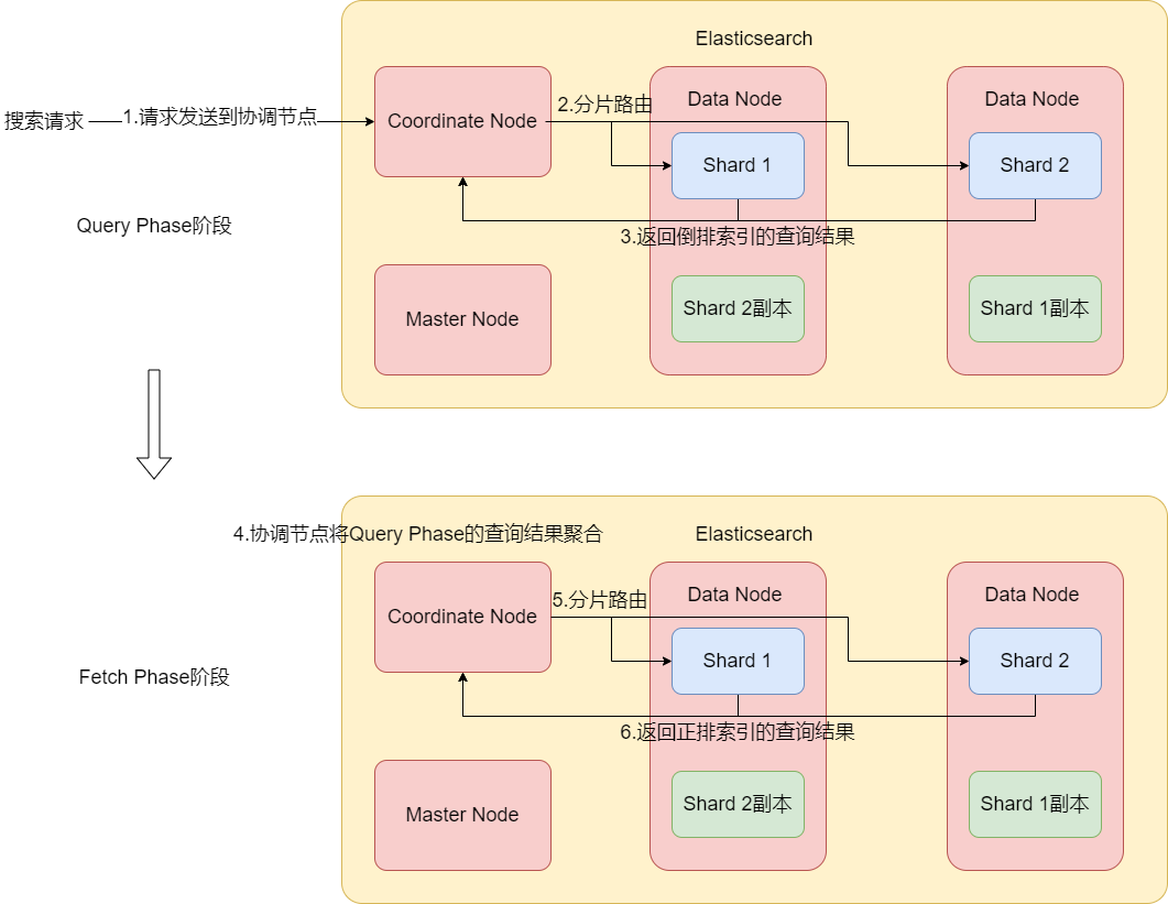 搜索流程分为两个阶段:Query Phase阶段(查询倒排索引)和Fetch Phase阶段(获取正排索引的数据):
