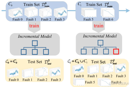 FSFIL的任务设置如图1所示:任务按阶段到达,基础任务(如任务0)有充足样本,后续任务(如任务1、2等)则样本有限(如W-way O-shot格式)。模型在每个任务学习后,需在所有已见故障类别上进行评估。