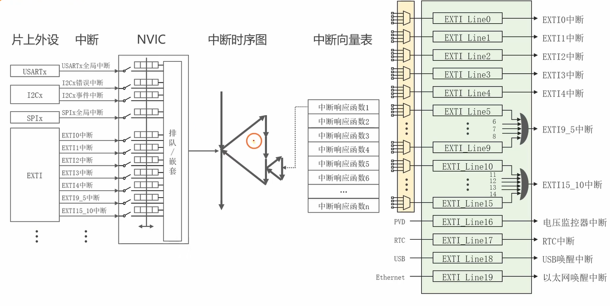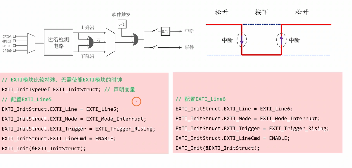 {// #1. 初始化PA5和PA6RCC_APB2PeriphClockCmd(RCC_APB2Periph_GPIOA, ENABLE);GPIO_InitTypeDef GPIO_InitStruct;// PA5GPIO_InitStruct.GPIO_Pin = GPIO_Pin_5;GPIO_InitStruct.GPIO_Mode = GPIO_Mode_IPU; // 输入上拉模式GPIO_Init(GPIOA, &GPIO_InitStruct);// PA6GPIO_InitStruct.GPIO_Pin = GPIO_Pin_6;GPIO_InitStruct.GPIO_Mode = GPIO_Mode_IPU;GPIO_Init(GPIOA, &GPIO_InitStruct);// #2. 复用器为EXTI5和EXTI6分配引脚RCC_APB2PeriphClockCmd(RCC_APB2Periph_AFIO, ENABLE);GPIO_EXTILineConfig(GPIO_PortSourceGPIOA, GPIO_PinSource5);GPIO_EXTILineConfig(GPIO_PortSourceGPIOA, GPIO_PinSource6);// #3. 初始化EXTI线EXTI_InitTypeDef EXTI_InitStruct;// 配置线5EXTI_InitStruct.EXTI_Line = EXTI_Line5;EXTI_InitStruct.EXTI_Mode = EXTI_Mode_Interrupt; // 中断EXTI_InitStruct.EXTI_Trigger = EXTI_Trigger_Rising; // 捕获上升沿EXTI_InitStruct.EXTI_LineCmd = ENABLE;EXTI_Init(&EXTI_InitStruct);// 配置线6EXTI_InitStruct.EXTI_Line = EXTI_Line6;EXTI_InitStruct.EXTI_Mode = EXTI_Mode_Interrupt; // 中断EXTI_InitStruct.EXTI_Trigger = EXTI_Trigger_Rising; // 捕获上升沿EXTI_InitStruct.EXTI_LineCmd = ENABLE;EXTI_Init(&EXTI_InitStruct);// #4. 配置中断NVIC_InitTypeDef NVIC_InitStruct;NVIC_InitStruct.NVIC_IRQChannel = EXTI9_5_IRQn; // 中断名称 打开stm32f10x.h头文件 搜索enum IRQn里面找NVIC_InitStruct.NVIC_IRQChannelPreemptionPriority = 0; // 抢占优先级NVIC_InitStruct.NVIC_IRQChannelSubPriority = 0; // 子优先级NVIC_InitStruct.NVIC_IRQChannelCmd = ENABLE; // 闭合开关NVIC_Init(&NVIC_InitStruct);