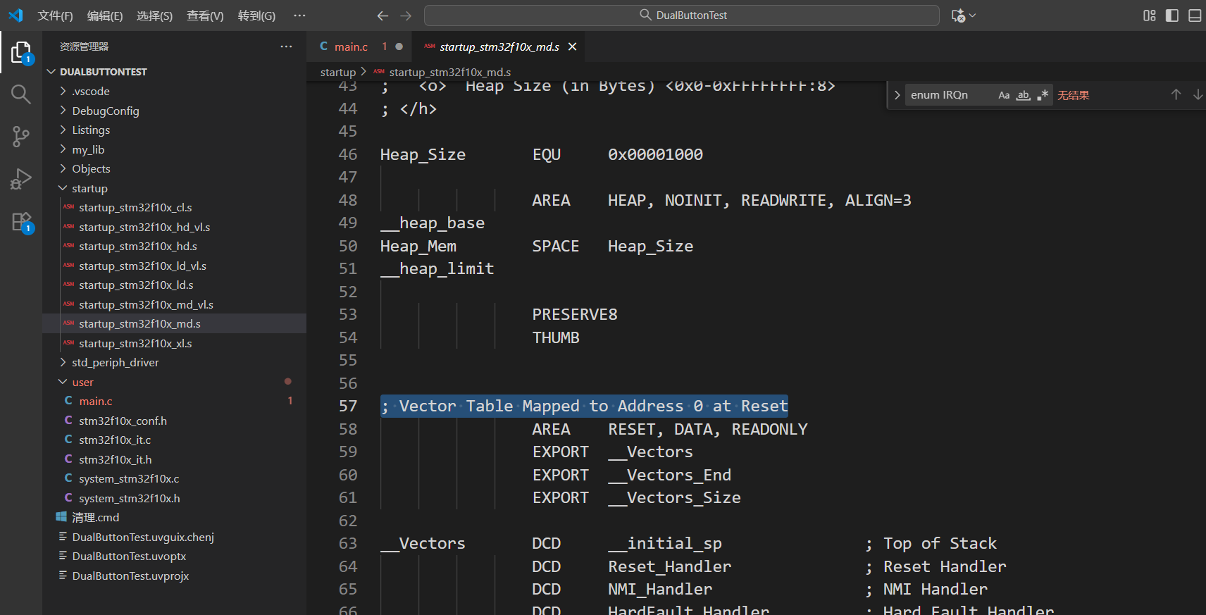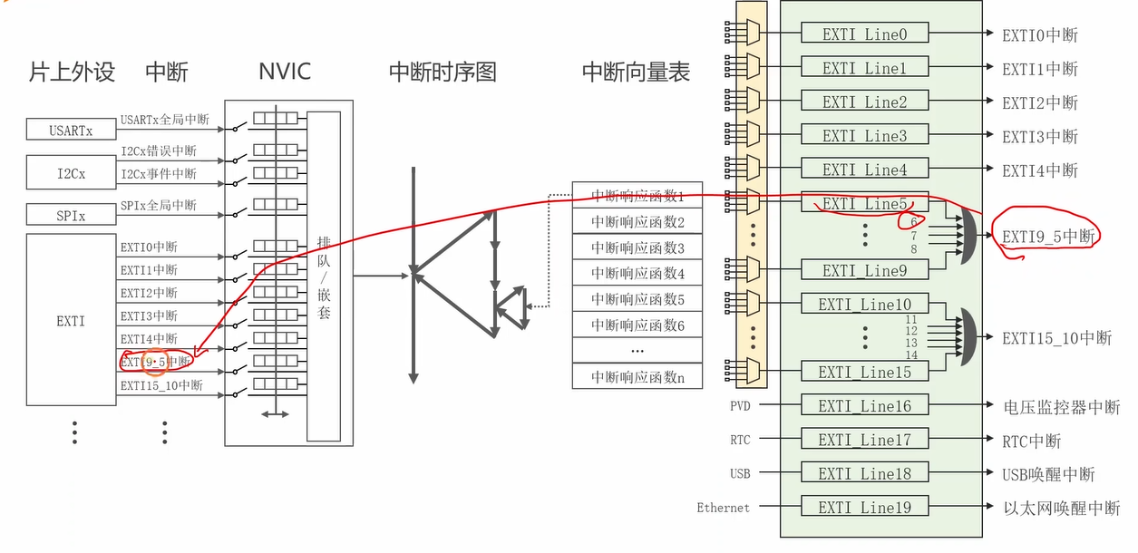 EXTI9_5_IRQHandler这就是本次要用的中断响应函数,因为本次用到线5和线6,线5-线9共用EXTI9_5中断,可看本篇2的分配EXTI线图