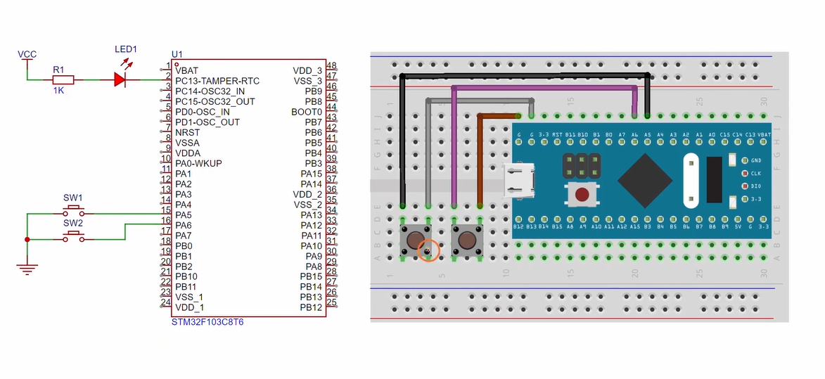 两个按钮实现控制板载LED的亮和灭,左边按钮控制点亮,右边按钮控制熄灭
