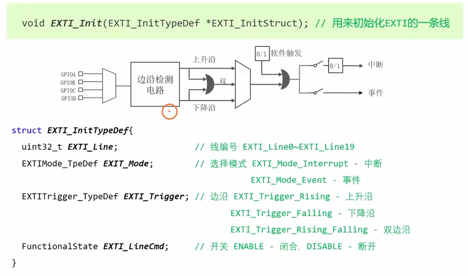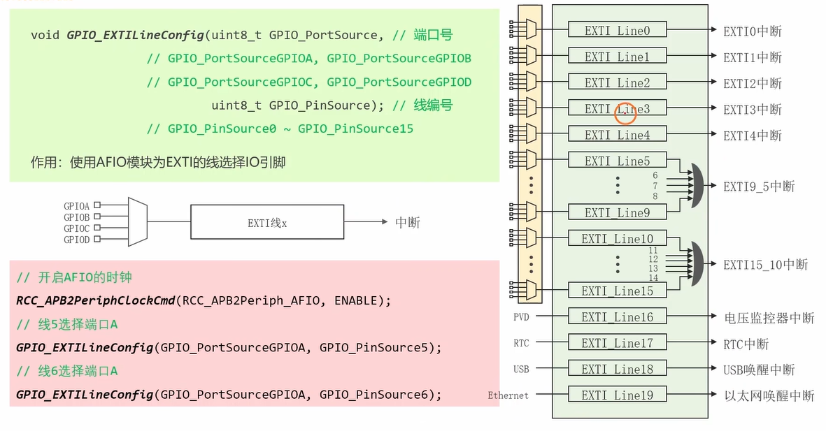 也就是配置复用器,配置复用器之前先使能一下AFIO时钟,然后调用GPIO_EXTILineConfig函数
