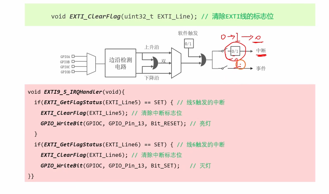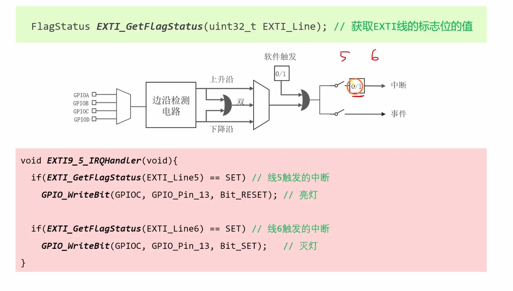 {// 线5触发的中断if (EXTI_GetFlagStatus(EXTI_Line5) == SET){EXTI_ClearFlag(EXTI_Line5); // 清除中断标志位GPIO_WriteBit(GPIOC, GPIO_Pin_13, Bit_RESET); // 亮灯}// 线6触发的中断if (EXTI_GetFlagStatus(EXTI_Line6) == SET){EXTI_ClearFlag(EXTI_Line6); // 清除中断标志位GPIO_WriteBit(GPIOC, GPIO_Pin_13, Bit_SET); // 灭灯}