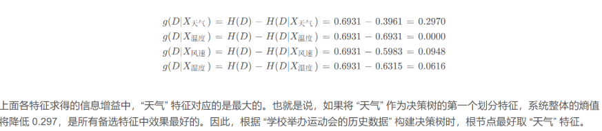 例子:集合 𝐷 的熵 𝐻(𝐷) = 0.6931 ,特征 “天气”、“温度”、“风速”、“湿度” 的条件熵分别为 𝐻(D | X天气) = 0.3961 、𝐻(D | X温度) = 0.6931、𝐻(D | X风速) = 0.5983、𝐻(D | X湿度) = 0.6315。