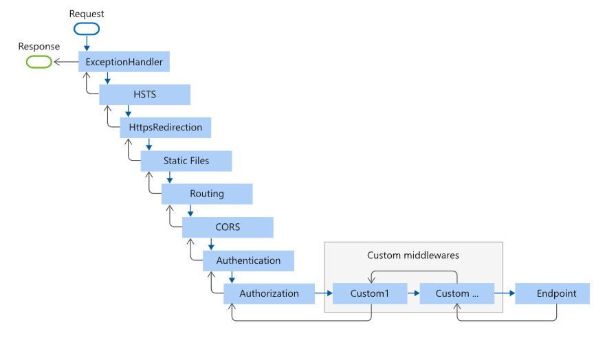 下图显示了 ASP.NET Core MVC 和 Razor Pages 应用的完整请求处理管道: