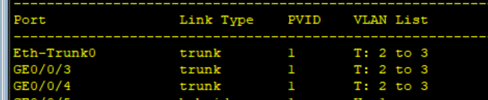 [SW2-Eth-Trunk0]port trunk allow-pass vlan 2 to 3[SW2-Eth-Trunk0]port-group group-member GigabitEthernet 0/0/3 GigabitEthernet 0/0/4 Eth-Trunk 0