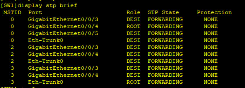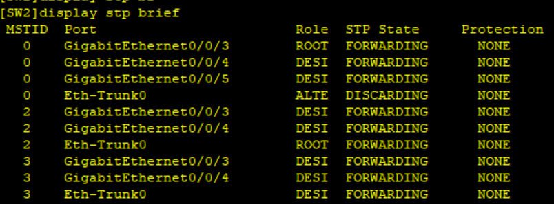 [SW1]stp instance 3 root secondary #SW1在实例3作为备份网桥SW2
