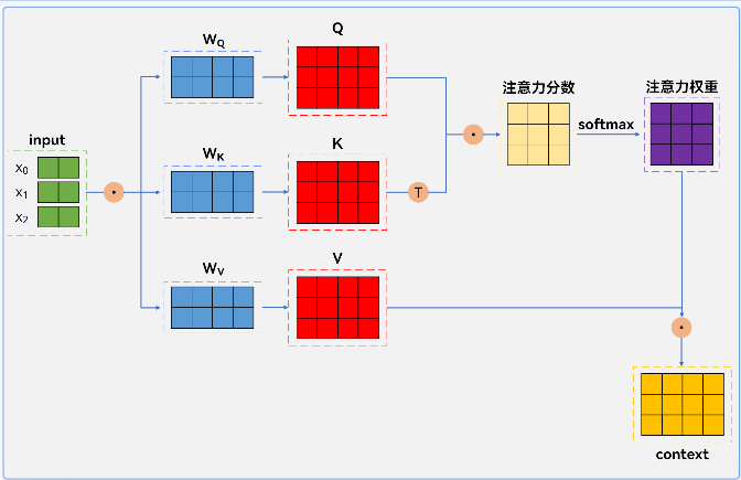 缩放后,经 softmax 得到权重矩阵,再与 V 相乘,得到 3×4 的输出矩阵 context,即为 Self-Attention 结果,融合了序列内各元素信息。
