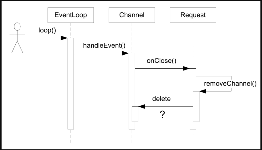 第1章我们探讨了多线程程序中的对象生命期管理技术。在单线程事件驱动的程序中,对象的生命期管理有时也不简单。比方说图7-55展示的例子,对方断开TCP连接,这个IO事件会触发Channel::handleEvent()调用,后者会回调用户提供的CloseCallback,而用户代码在onClose()中有可能析构Channel对象,这就造成了灾难。等于说Channel::handleEvent()执行到一半的时候,其所属的Channel对象本身被销毁了。这时程序立刻core dump就是最好的结果了。