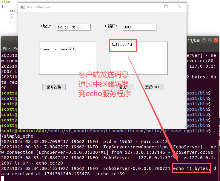 第3个参数是监听客户端的端口2003,当前客户端连接时,连接的端口是2003,连接成功能,发消息时,由tcprelay把消息转发到echo服务程序。
