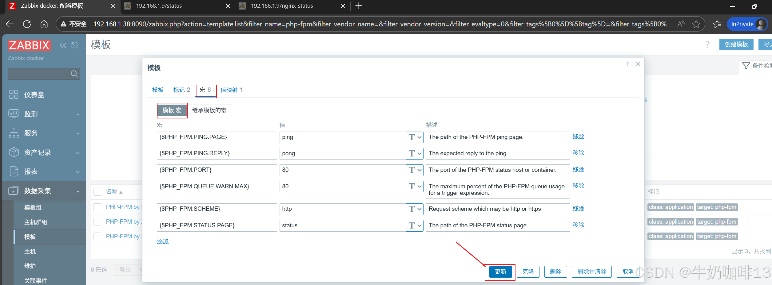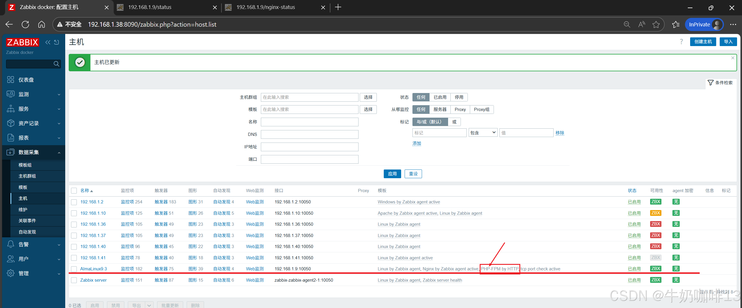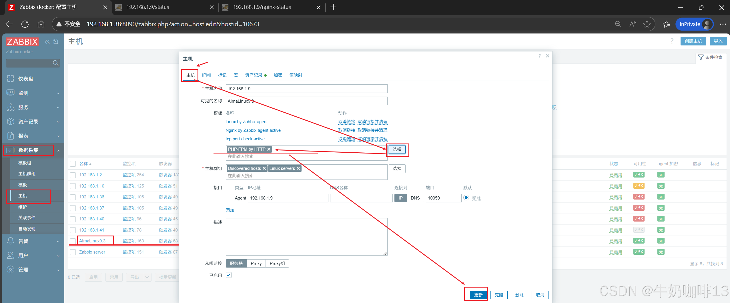 《2》将【PHP-FPM by HTTP】模板链接到安装了nginx+php-fpm的主机上(即:打开zabbix的web界面左侧的导航栏【数据采集】-->【主机】-->选择安装了nginx+php-fpm服务的主机(如:192.168.1.9)-->【主机】-->模板选择【PHP-FPM by HTTP】-->【更新】)即可。