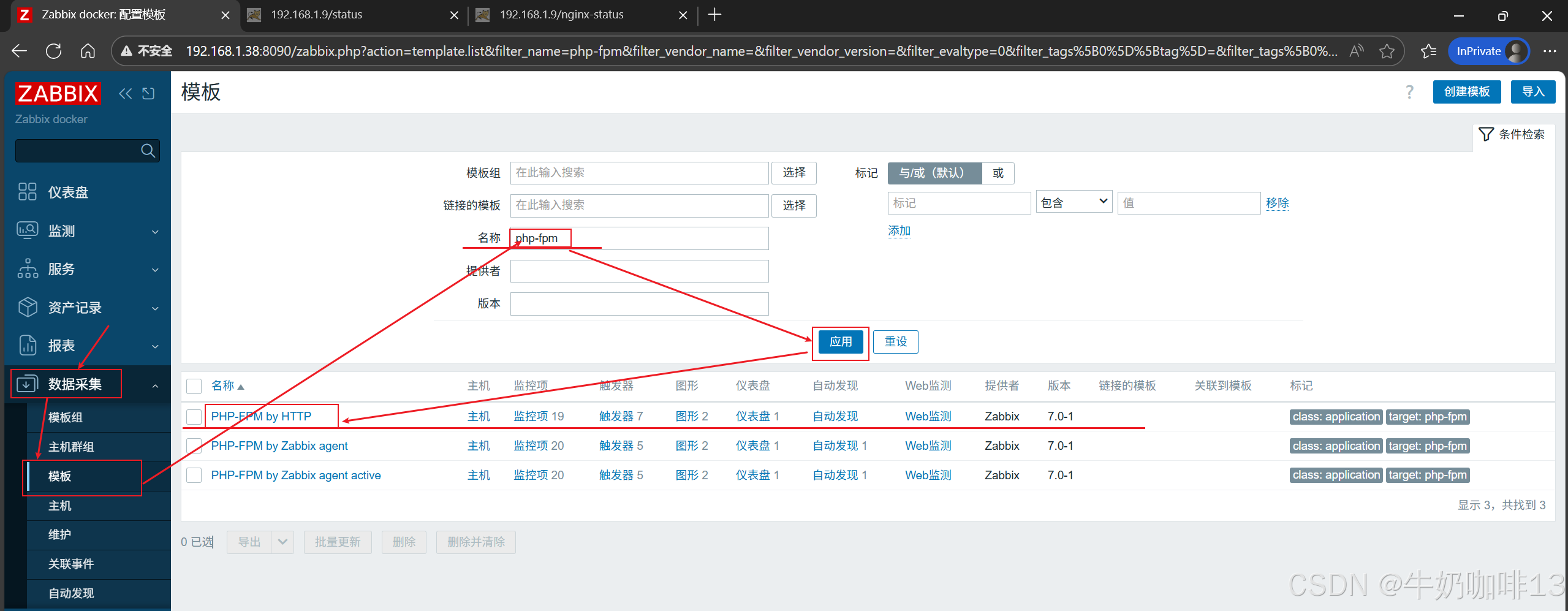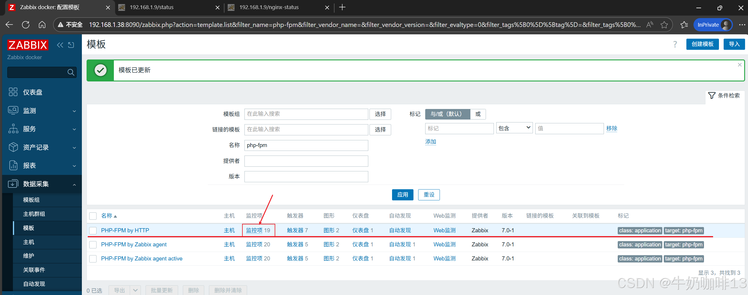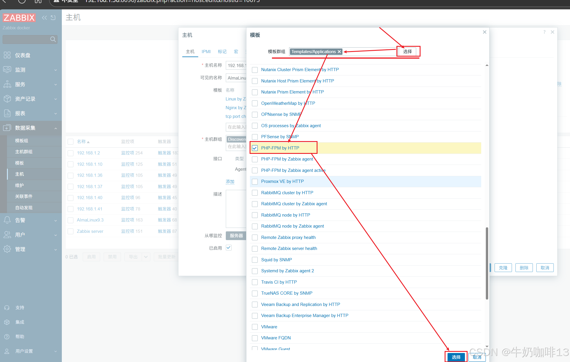《2》将【PHP-FPM by HTTP】模板链接到安装了nginx+php-fpm的主机上(即:打开zabbix的web界面左侧的导航栏【数据采集】-->【主机】-->选择安装了nginx+php-fpm服务的主机(如:192.168.1.9)-->【主机】-->模板选择【PHP-FPM by HTTP】-->【更新】)即可。