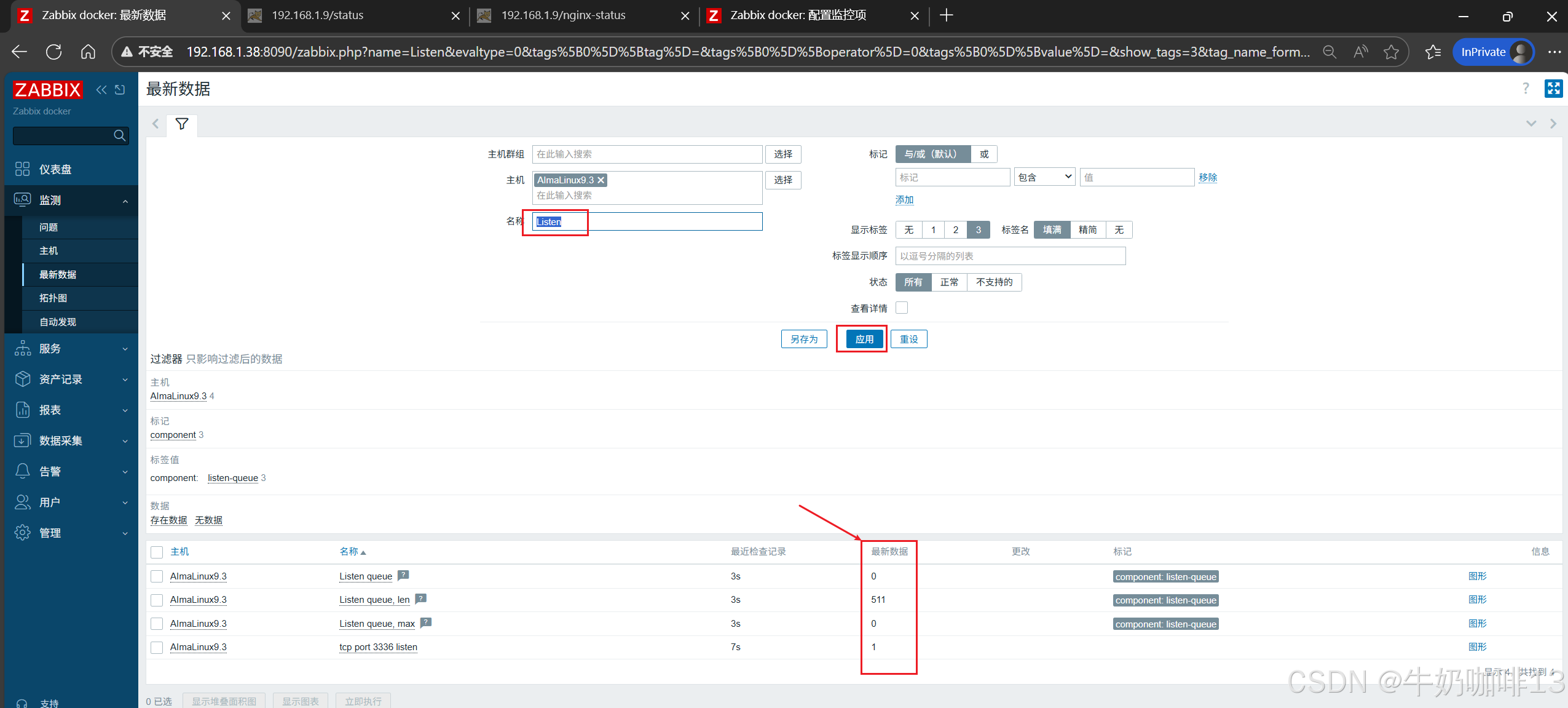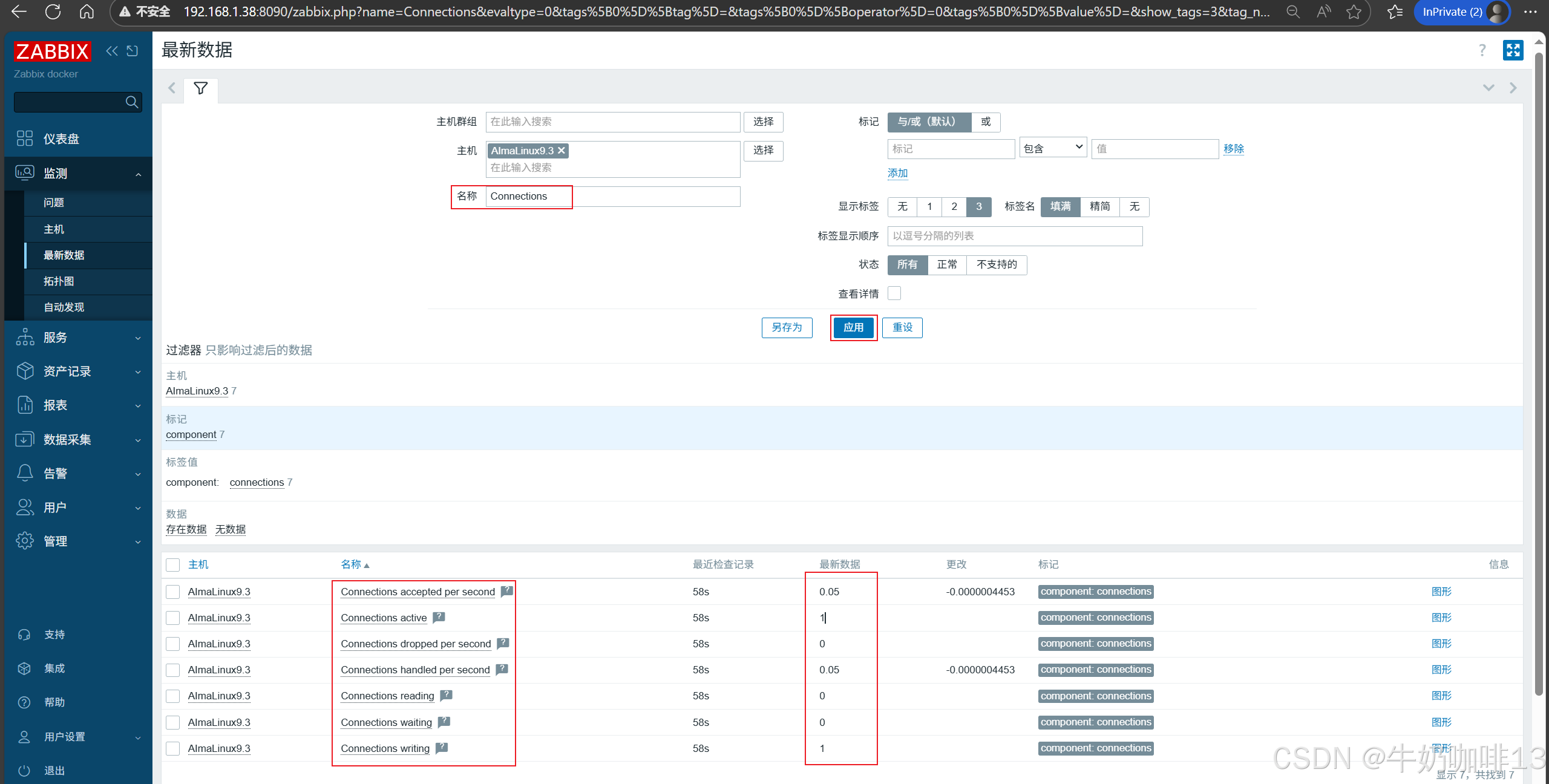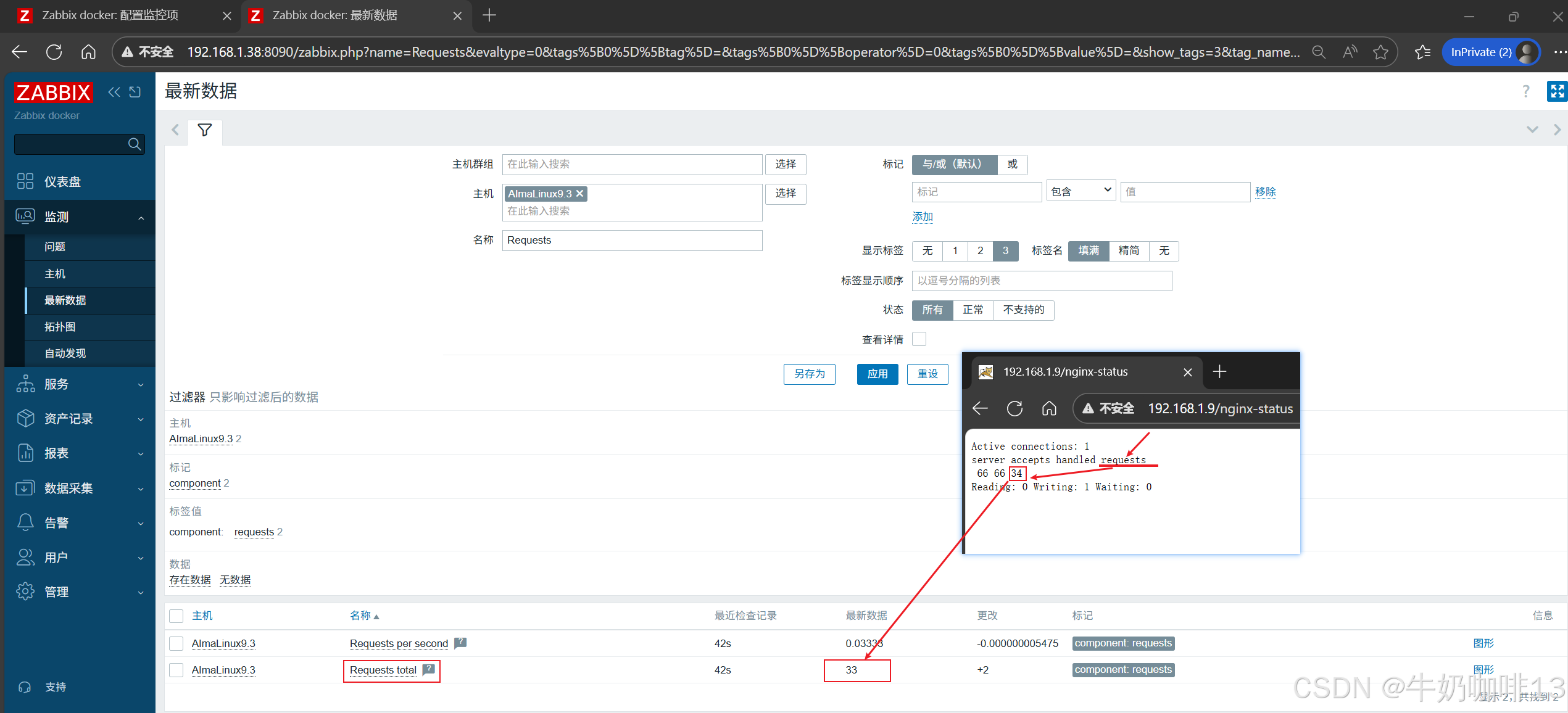 《3》监测给nginx服务所在主机配置的nginx监测模板数据是否采集到进行监控(即:打开zabbix的web界面左侧的导航栏【监测】-->【主机】-->选择安装了nginx服务的主机(如:192.168.1.9)-->【最新数据】-->使用【名称】过滤 Requests、 Connections)