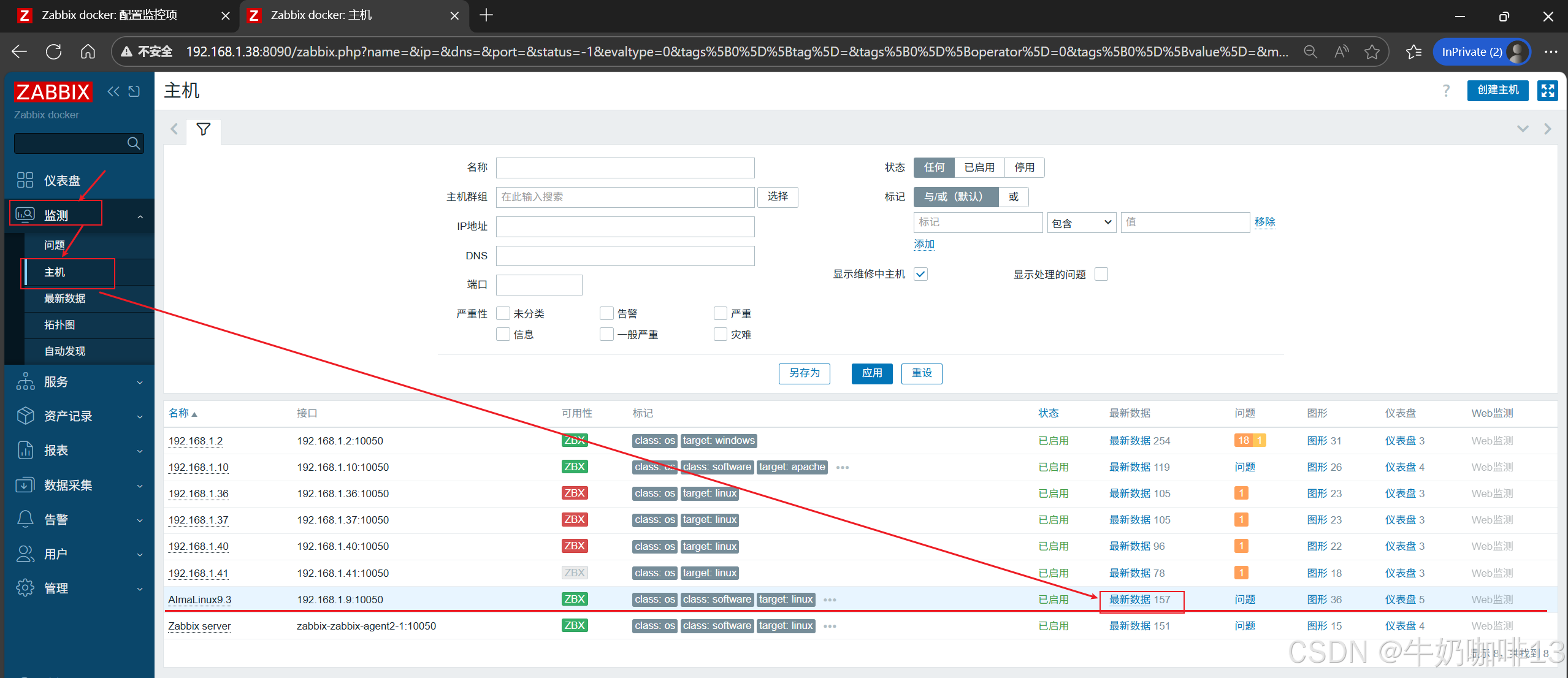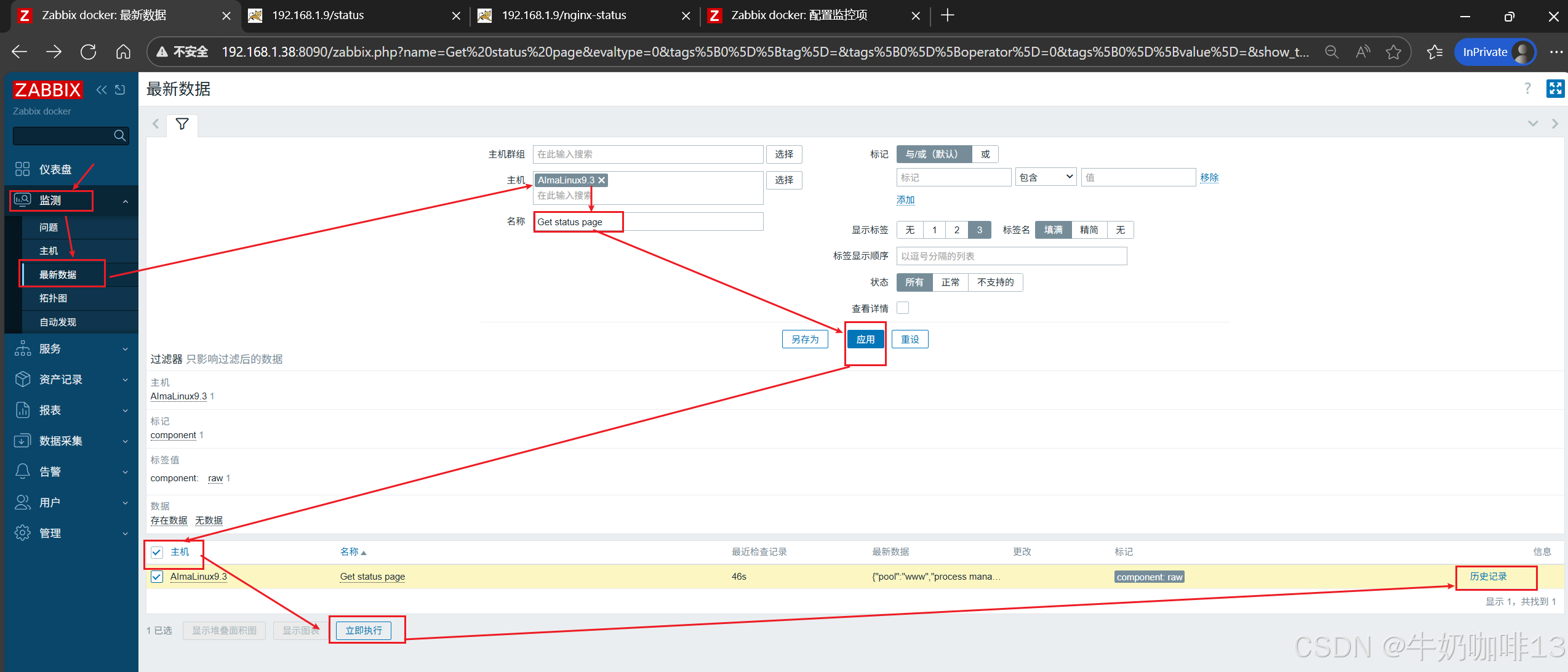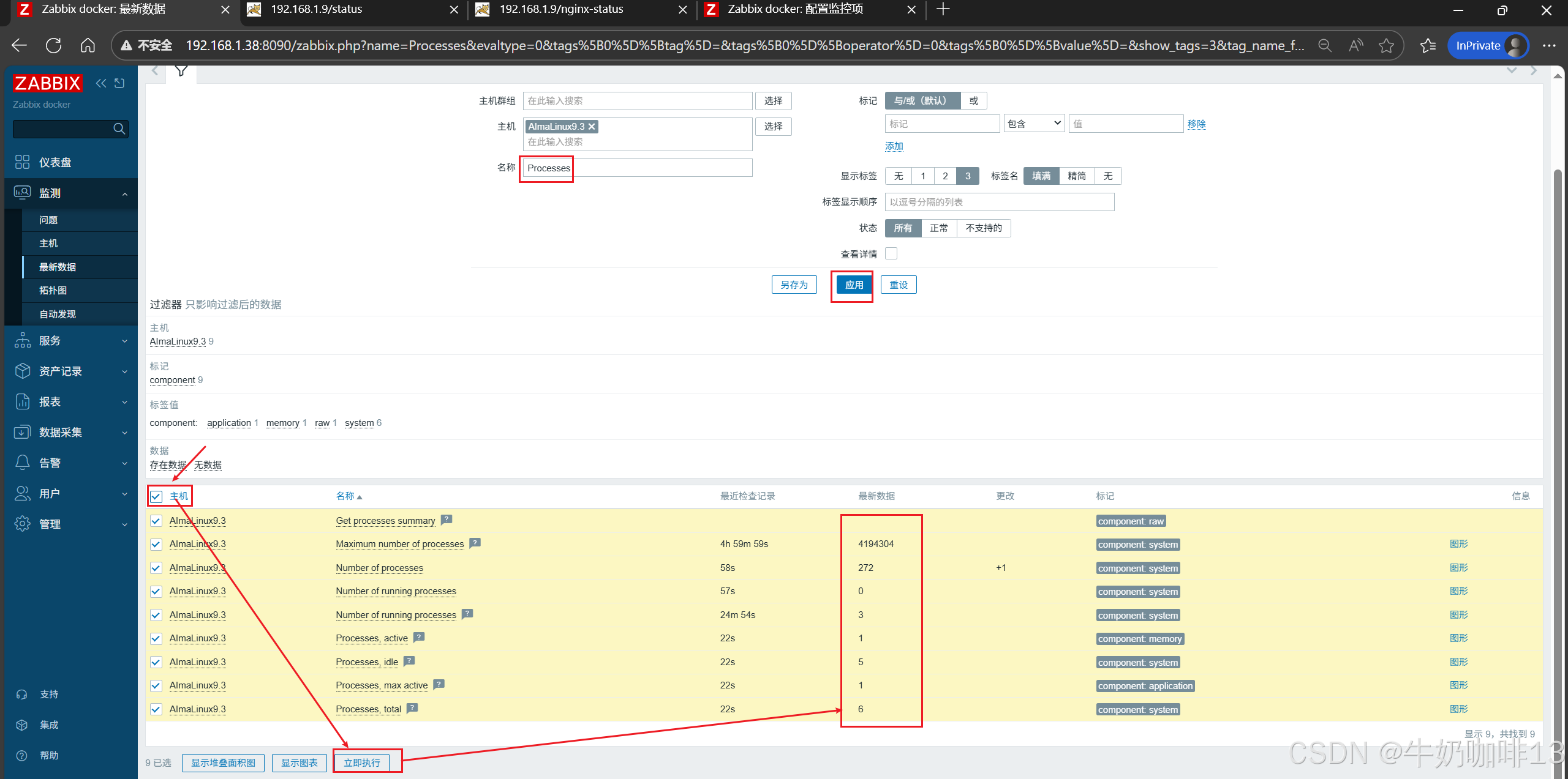 《3》监测给nginx服务所在主机配置的nginx监测模板数据是否采集到进行监控(即:打开zabbix的web界面左侧的导航栏【监测】-->【主机】-->选择安装了nginx服务的主机(如:192.168.1.9)-->【最新数据】-->使用【名称】过滤 Requests、 Connections)