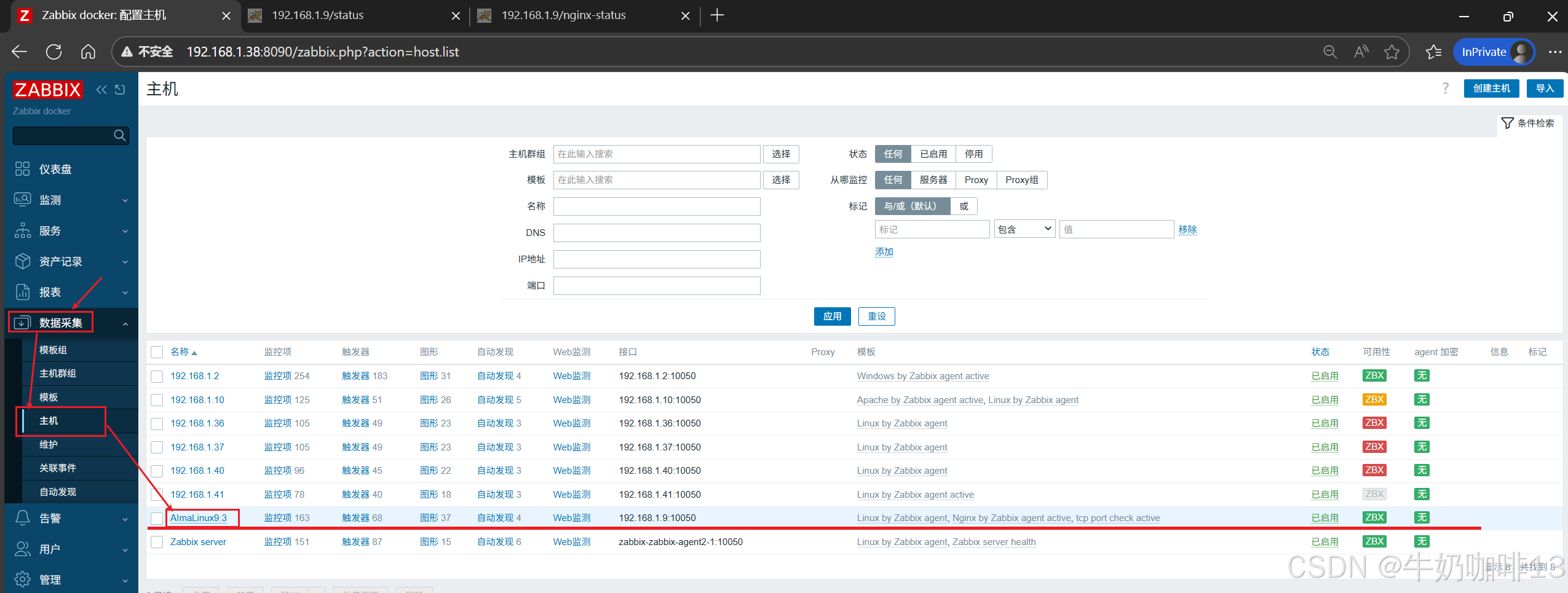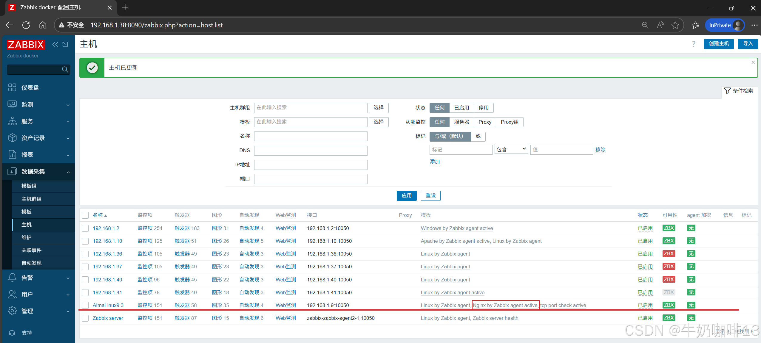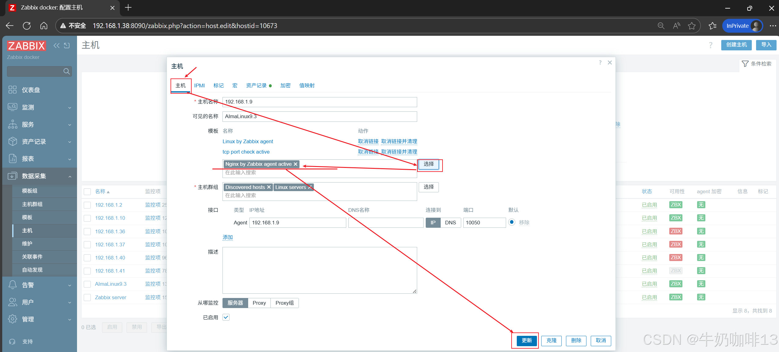 《2》将【Nginx by Zabbix agent active】模板链接到安装了nginx的主机上(即:打开zabbix的web界面左侧的导航栏【数据采集】-->【主机】-->选择安装了nginx服务的主机(如:192.168.1.9)-->【主机】-->模板选择【Nginx by Zabbix agent active】-->【更新】)即可。