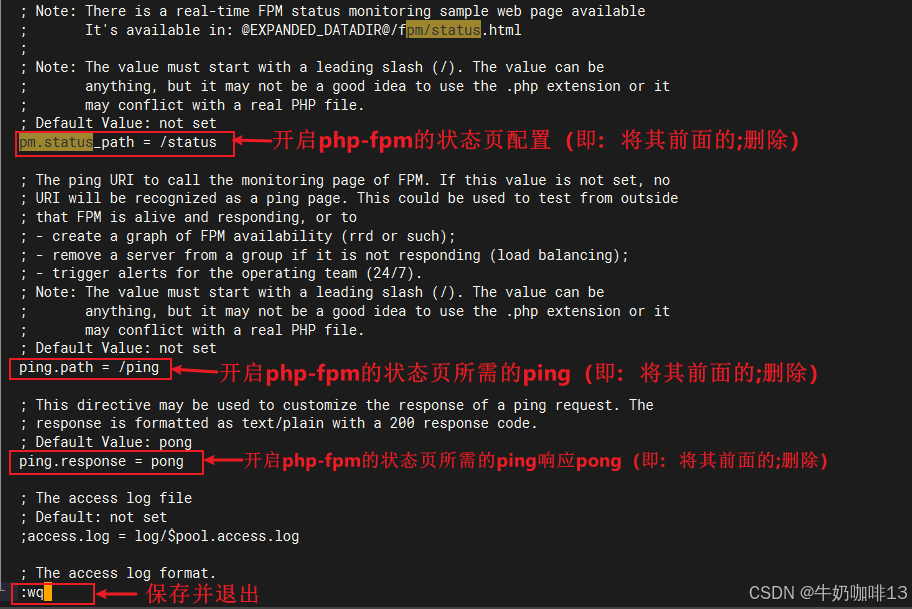 #开启php-fpm的配置文www.conf的状态页内容参数(即取消如下三个内容前面的分号;后保存退出即可)