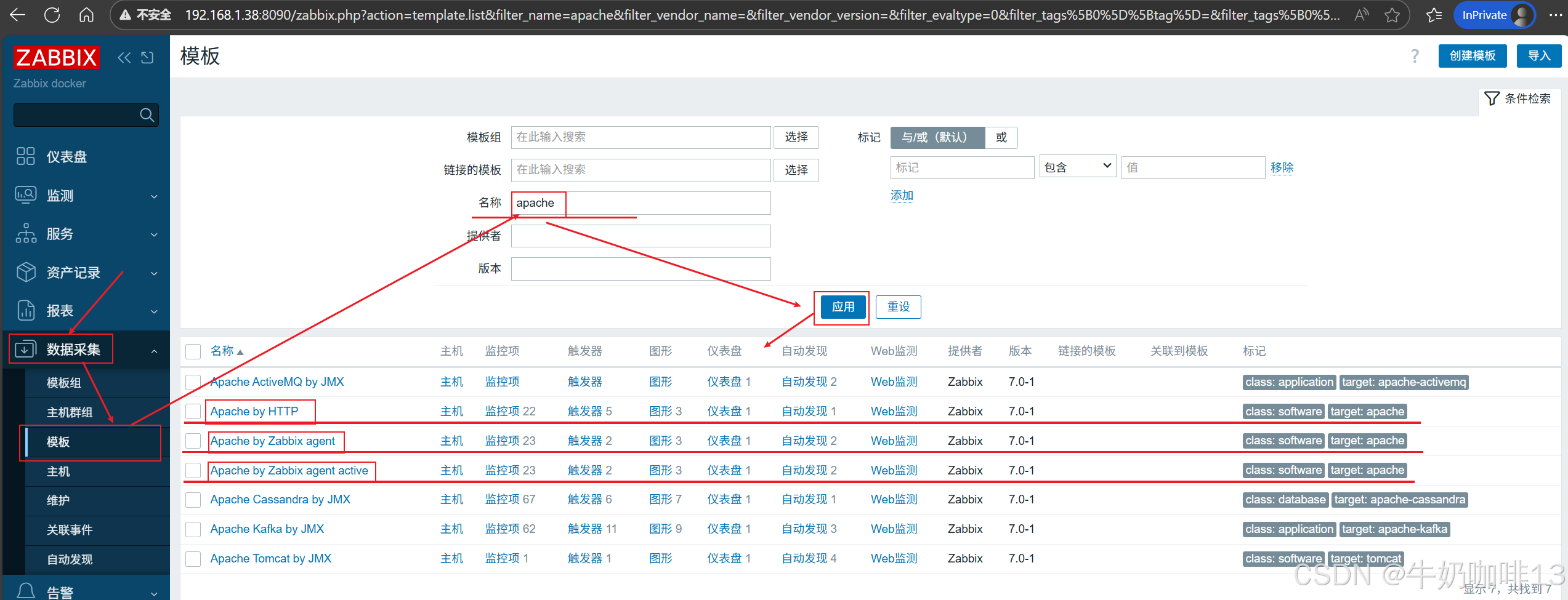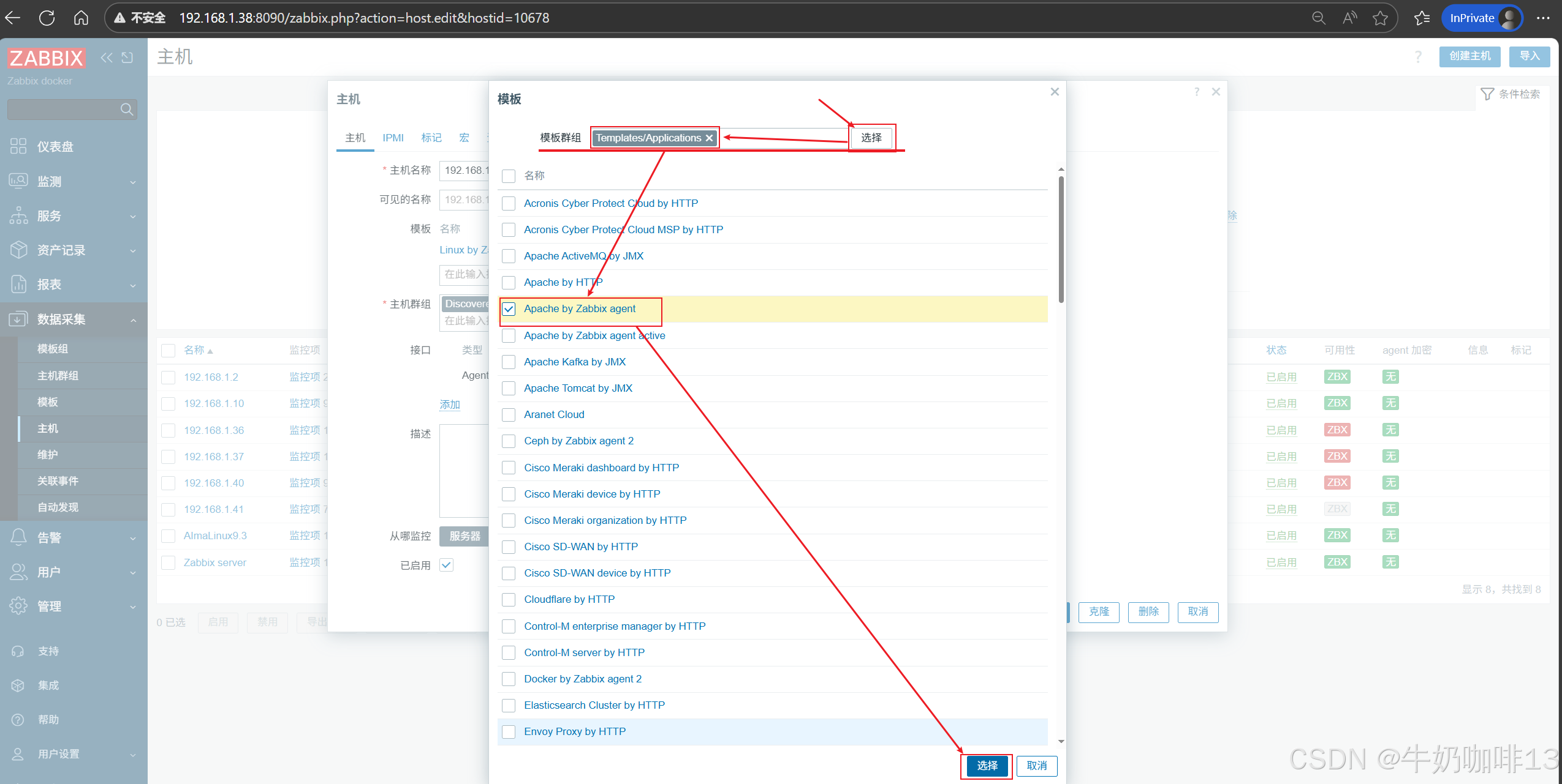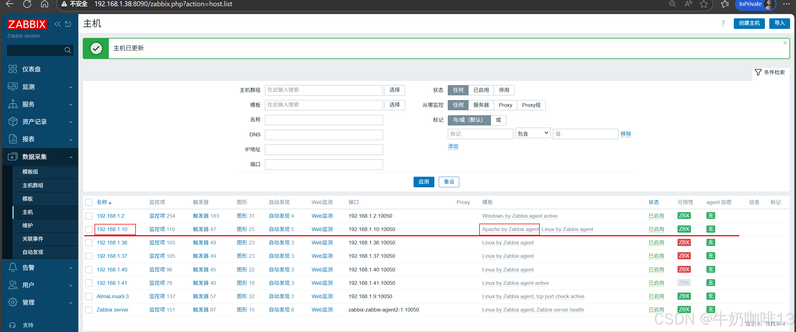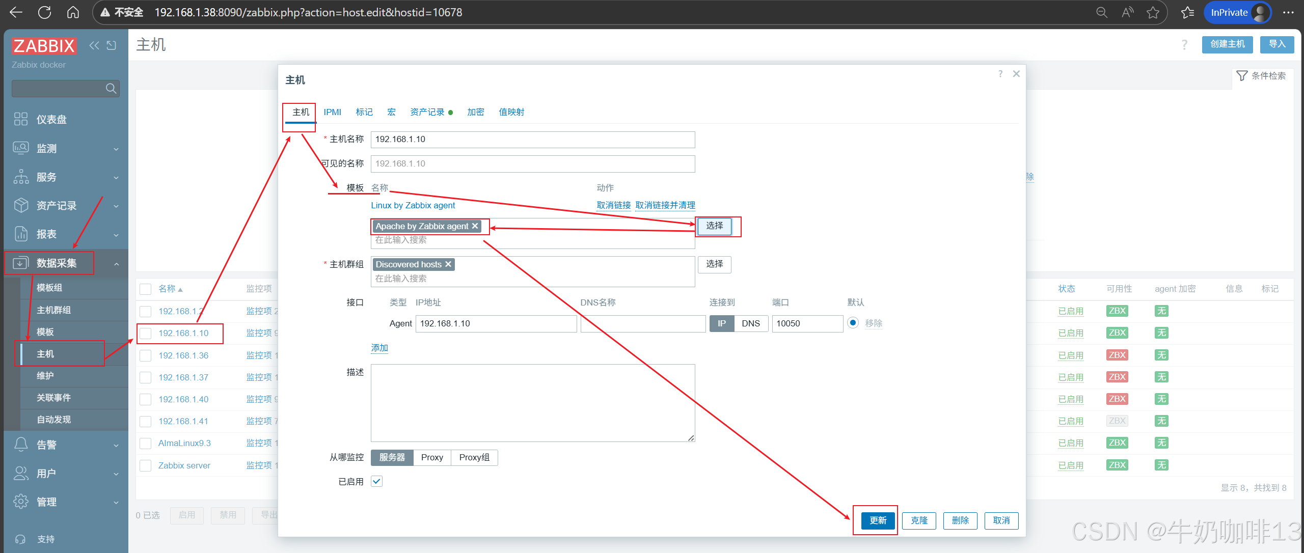 《2》将【Apache by Zabbix agent】模板链接到安装了Apache的主机上(即:打开zabbix的web界面左侧的导航栏【数据采集】-->【主机】-->选择安装了Apache服务的主机(如:192.168.1.10)-->【主机】-->模板选择【Apache by Zabbix agent】-->【更新】)即可。