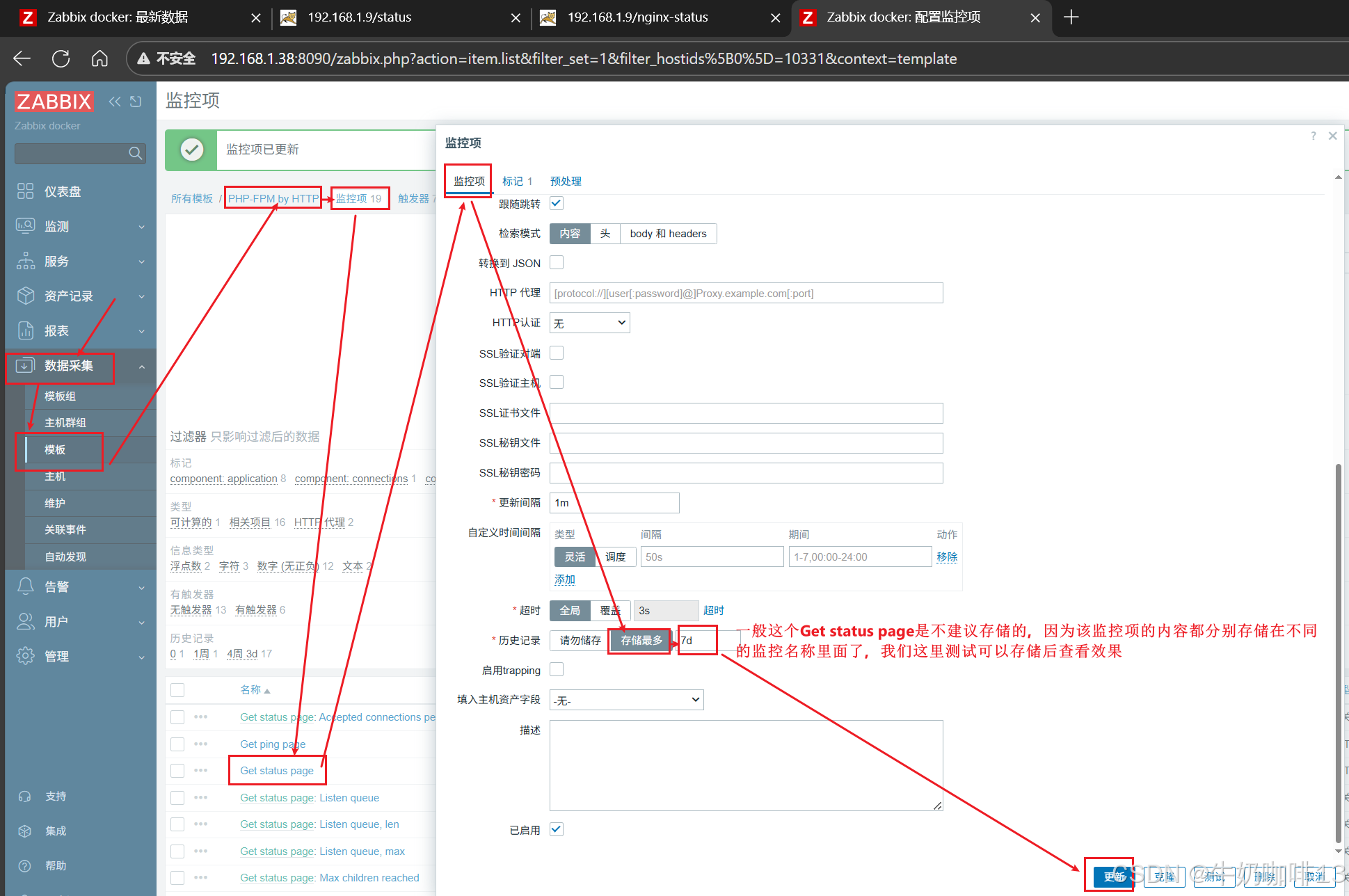 默认【Get status page】的监控项没有内容这是因为默认该监控项不存储数据,我们可以修模板【PHP-FPM by HTTP】的【Get status page】监控项保存7天后再次查看即可获取到数据:
