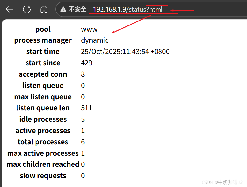 systemctl restart php-fpm.service #4-查看当前系统的IP地址后查看php-fpm状态页(使用nginx+php-fpm的服务器IP/status;如:http://192.168.1.9/status)