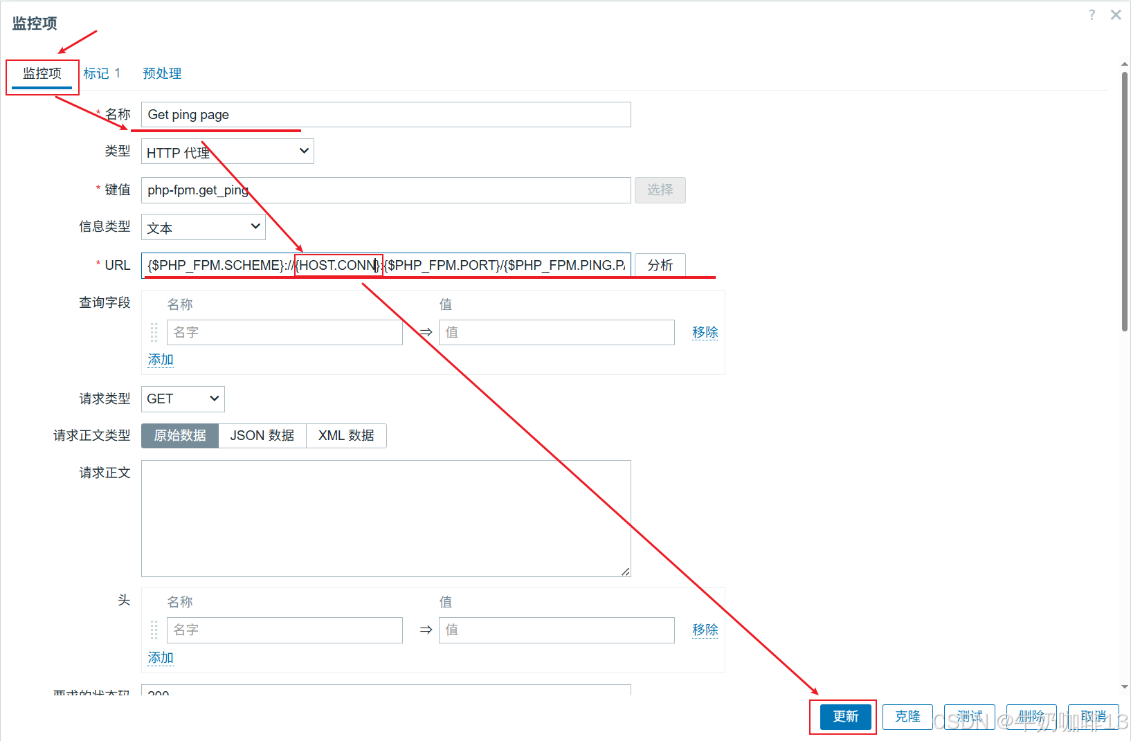 ①是将【PHP-FPM by HTTP】模板里面的【Get ping page】监控项中的【URL】内容的宏变量{$PHP_FPM.HOST}修改为{HOST.CONN}。