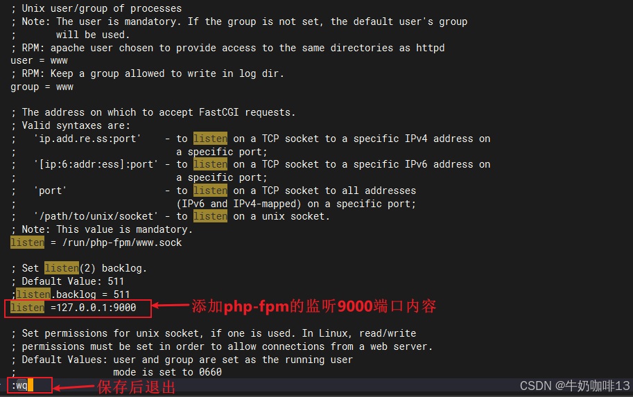 vi www.conf#检查php-fpm的配置文件www.conf是否配置了监听端口9000配置,没有则需要配置上