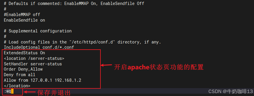 vi httpd.conf#2-编辑配置文件【cd /etc/httpd/conf/httpd.conf】并在其末尾添加开启状态页的配置(注意:开启该状态页配置的内容中:Allow from 后面配置的IP地址其实只用127.0.0.1就可以了;我这里为了方便自己的本机的windows电脑192.168.1.2访问因此添加上了)