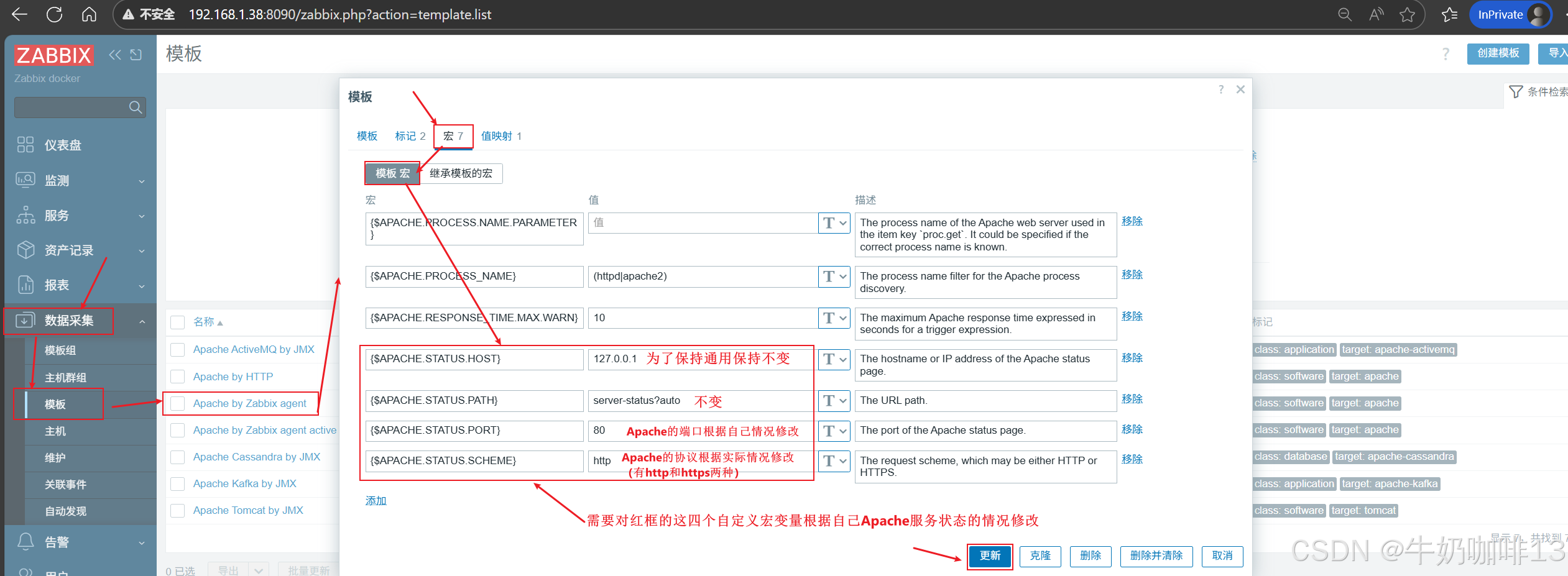 《1》打开zabbix的web界面左侧的导航栏【数据采集】-->【模板】-->在模板界面顶部的【名称】输入框中输入apache后点击-->【应用】即可过滤出所有Apache的相关模板;我们这里就选择被动模式的模板【Apache by Zabbix agent】打开-->选择【宏】需要对最后两个【{$APACHE.STATUS.PORT}】【{$APACHE.STATUS.SCHEME}】根据实际情况修改。