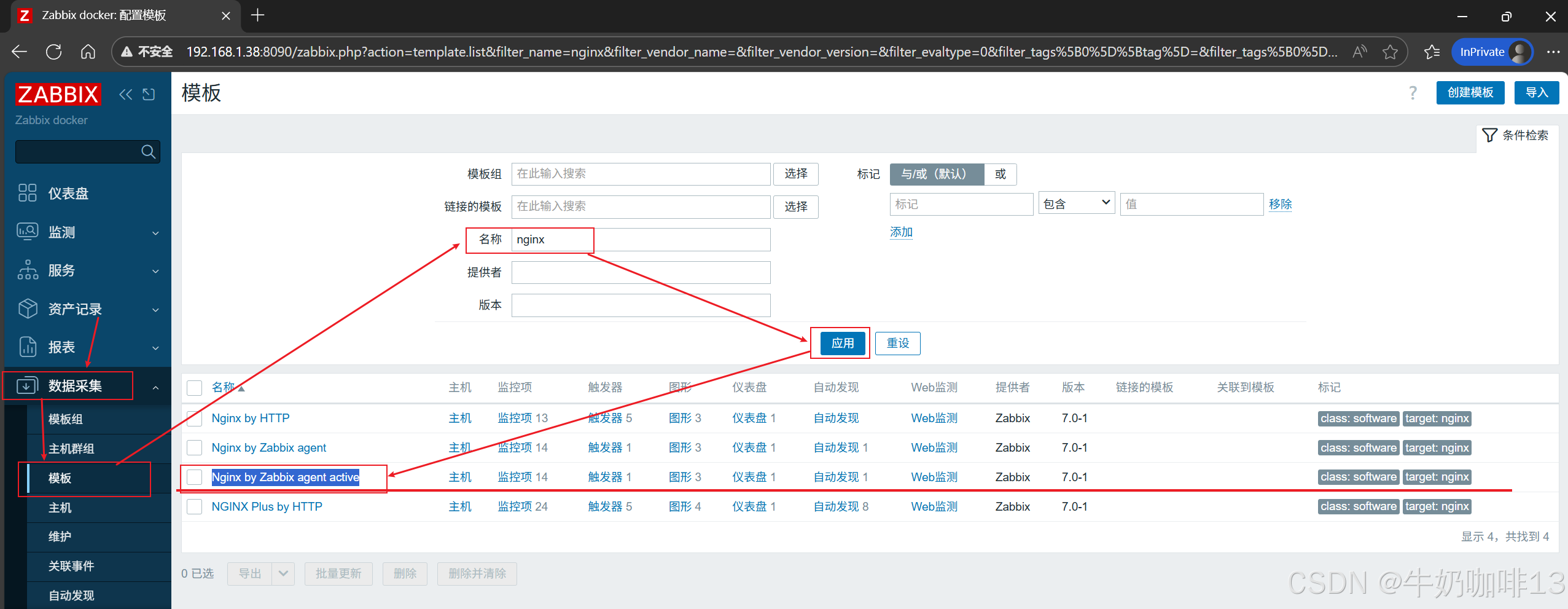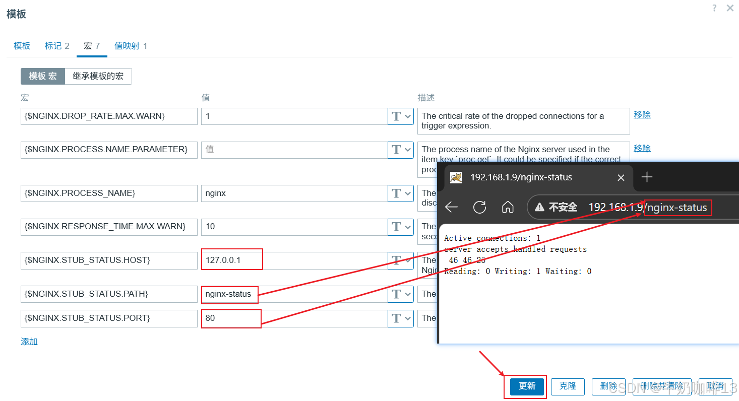 《1》打开zabbix的web界面左侧的导航栏【数据采集】-->【模板】-->在模板界面顶部的【名称】输入框中输入nginx后点击-->【应用】即可过滤出所有nginx的相关模板;我们这里就选择主动模式的模板【Nginx by Zabbix agent active】打开-->选择【宏】需要对最后三个【{$NGINX.STUB_STATUS.HOST}】【{$NGINX.STUB_STATUS.PATH}】【{$NGINX.STUB_STATUS.PORT}】根据实际情况修改。