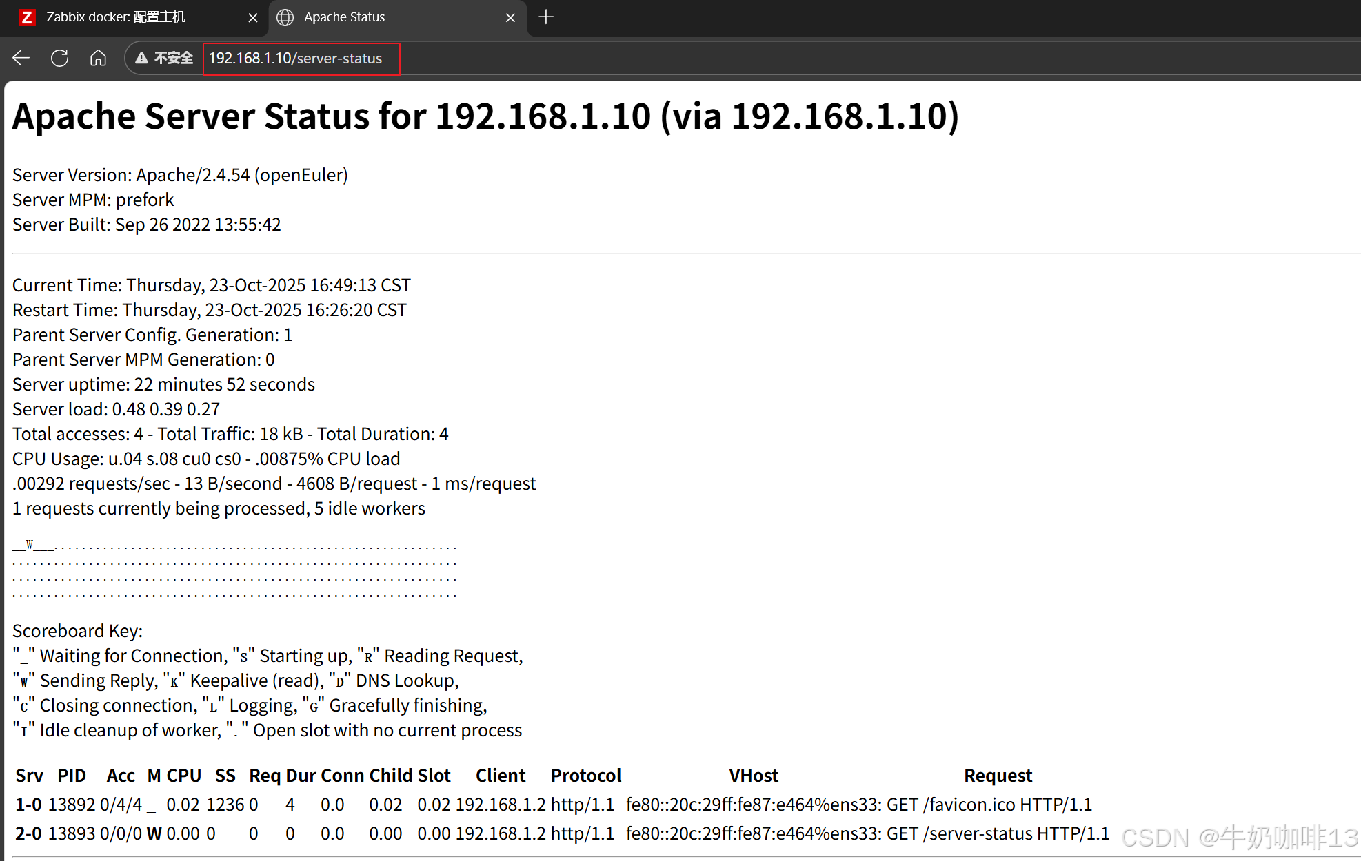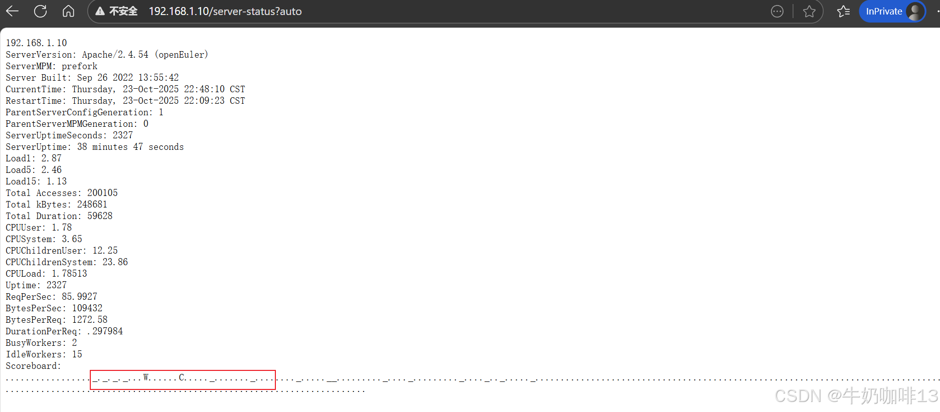 关于请求的各种状态类型我们可以使用压测工具siege对该Apache服务状态进行测试时,不停的刷新【Apache服务所在服务器IP/server-status?auto】(如:192.168.1.10/server-status?auto)最底部即可看到不断变化,详细操作如下: