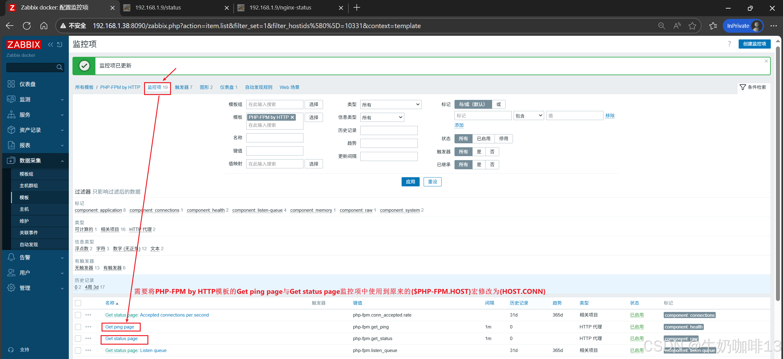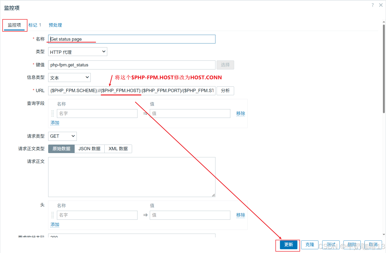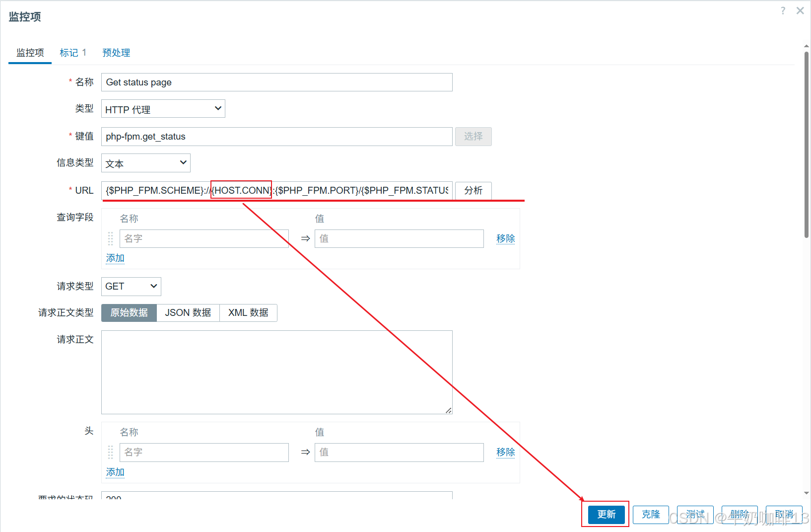 ②是将【PHP-FPM by HTTP】模板里面的【Get status page】监控项中的【URL】内容的宏变量{$PHP_FPM.HOST}修改为{HOST.CONN}。