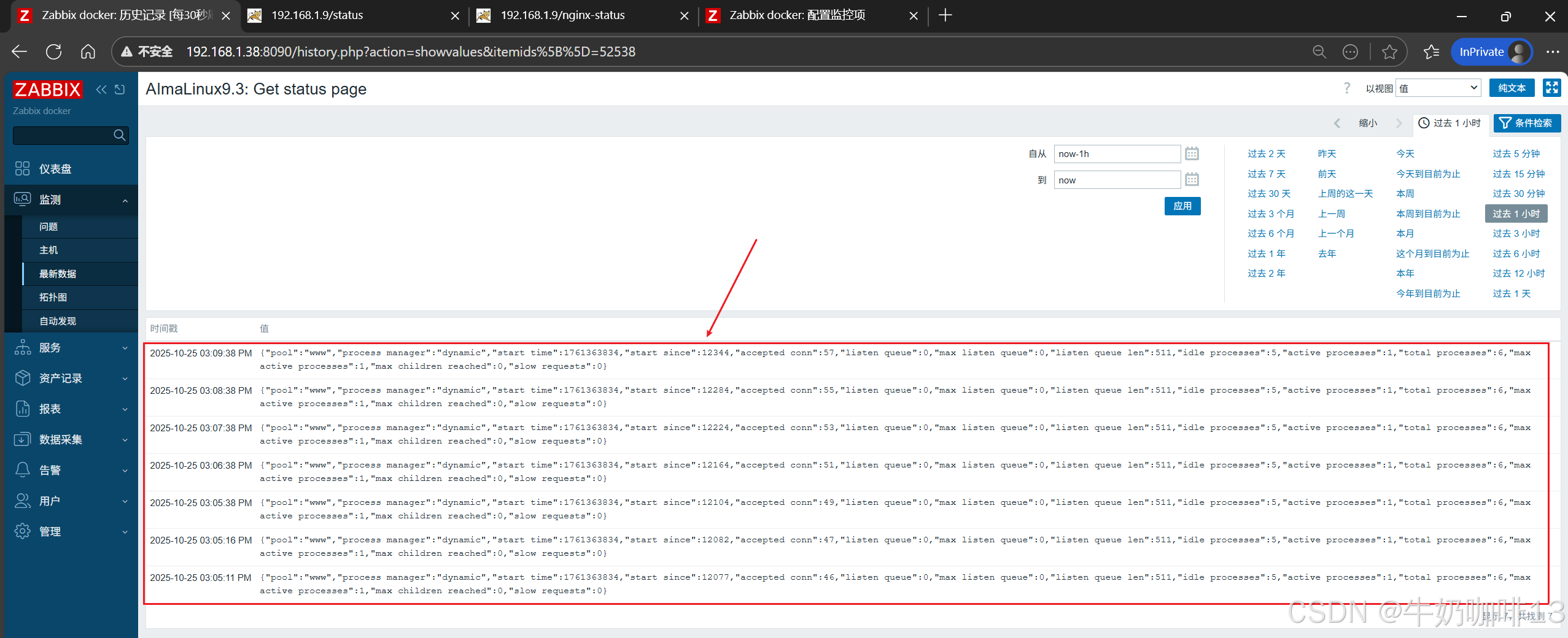 《3》监测给nginx+php-fpm服务所在主机配置的php-fpm监测模板数据是否采集到进行监控(即:打开zabbix的web界面左侧的导航栏【监测】-->【主机】-->选择安装了nginx+php-fpm服务的主机(如:192.168.1.9)-->【最新数据】-->使用【名称】过滤 Listen、Processes、Get status page)