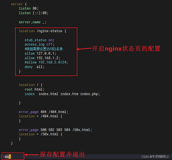 #编辑nginx.conf配置文件实现开启状态页的server完整内容server {listen 80;listen [::]:80;server_name _;location /nginx-status {stub_status on;access_log off;#根据需要设置访问白名单allow 127.0.0.1;allow 192.168.1.2;#allow 192.168.3.0/24;deny all;}location / {root html;index index.html index.htm index.php;}error_page 404 /404.html;location = /404.html {}error_page 500 502 503 504 /50x.html;location = /50x.html {}}#2-验证配置的nginx.conf是否正确