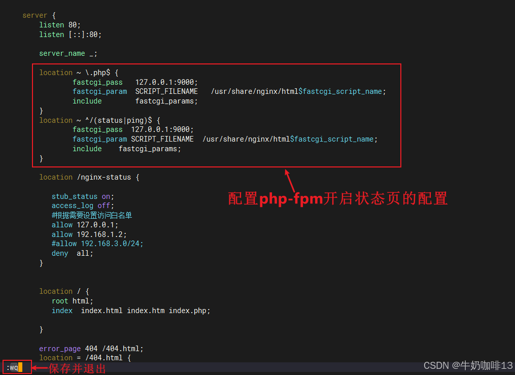 vi nginx.conf#nginx.conf文件添加php-fpm的状态页内容server {listen 80;listen [::]:80;server_name _;location ~ \.php$ {fastcgi_pass 127.0.0.1:9000;fastcgi_param SCRIPT_FILENAME /usr/share/nginx/html$fastcgi_script_name;include fastcgi_params;}location ~ ^/(status|ping)$ {fastcgi_pass 127.0.0.1:9000;fastcgi_param SCRIPT_FILENAME /usr/share/nginx/html$fastcgi_script_name;include fastcgi_params;}location /nginx-status {stub_status on;access_log off;#根据需要设置访问白名单allow 127.0.0.1;allow 192.168.1.2;#allow 192.168.3.0/24;deny all;}location / {root html;index index.html index.htm index.php;}error_page 404 /404.html;location = /404.html {}error_page 500 502 503 504 /50x.html;location = /50x.html {}}#3-验证配置的nginx.conf是否正确,验证nginx.conf的配置都正确后重启nginx服务