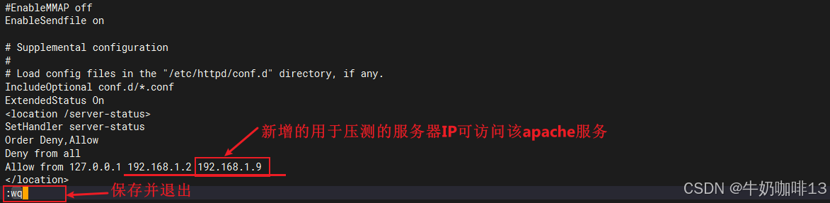 #1-先对Apache服务器(如:192.168.1.10)上的配置文件【/etc/httpd/conf/httpd.conf】进行编辑添加上对该Apache服务器状态压测服务器的IP(如:192.168.1.9)后保存退出并重启httpd服务