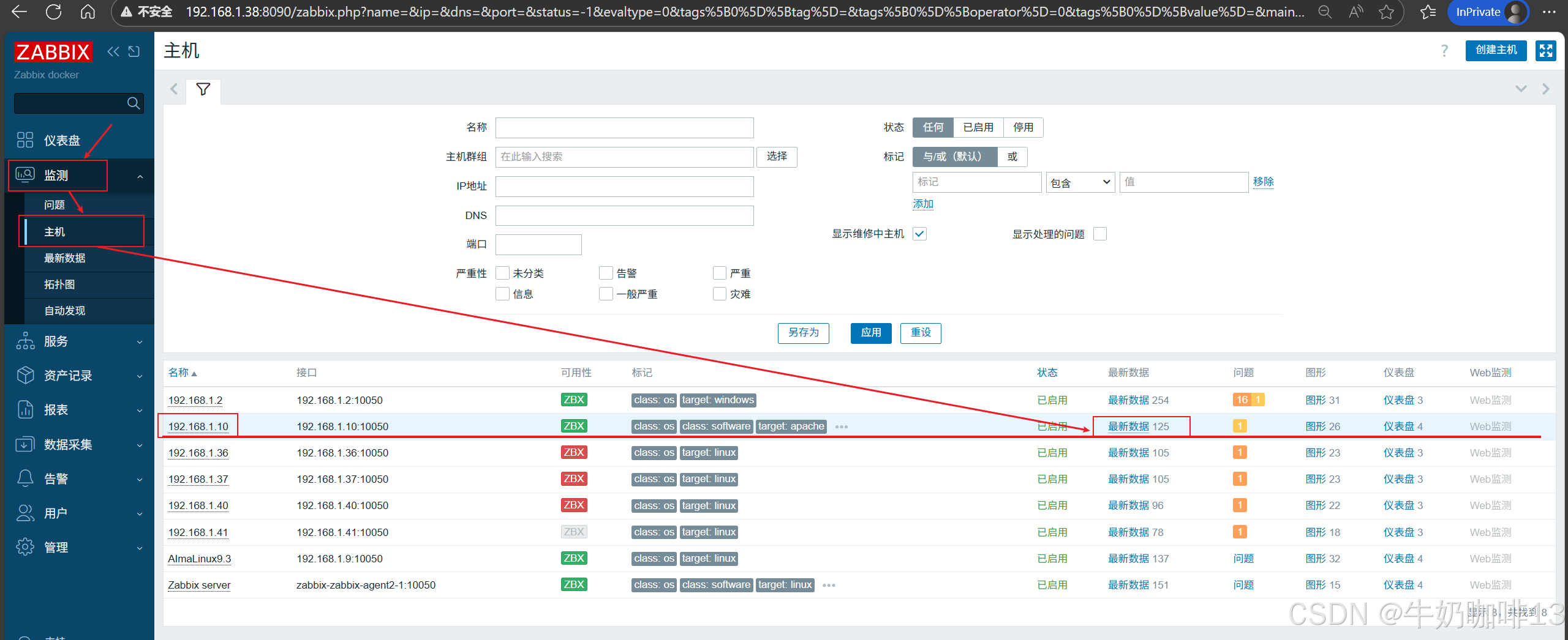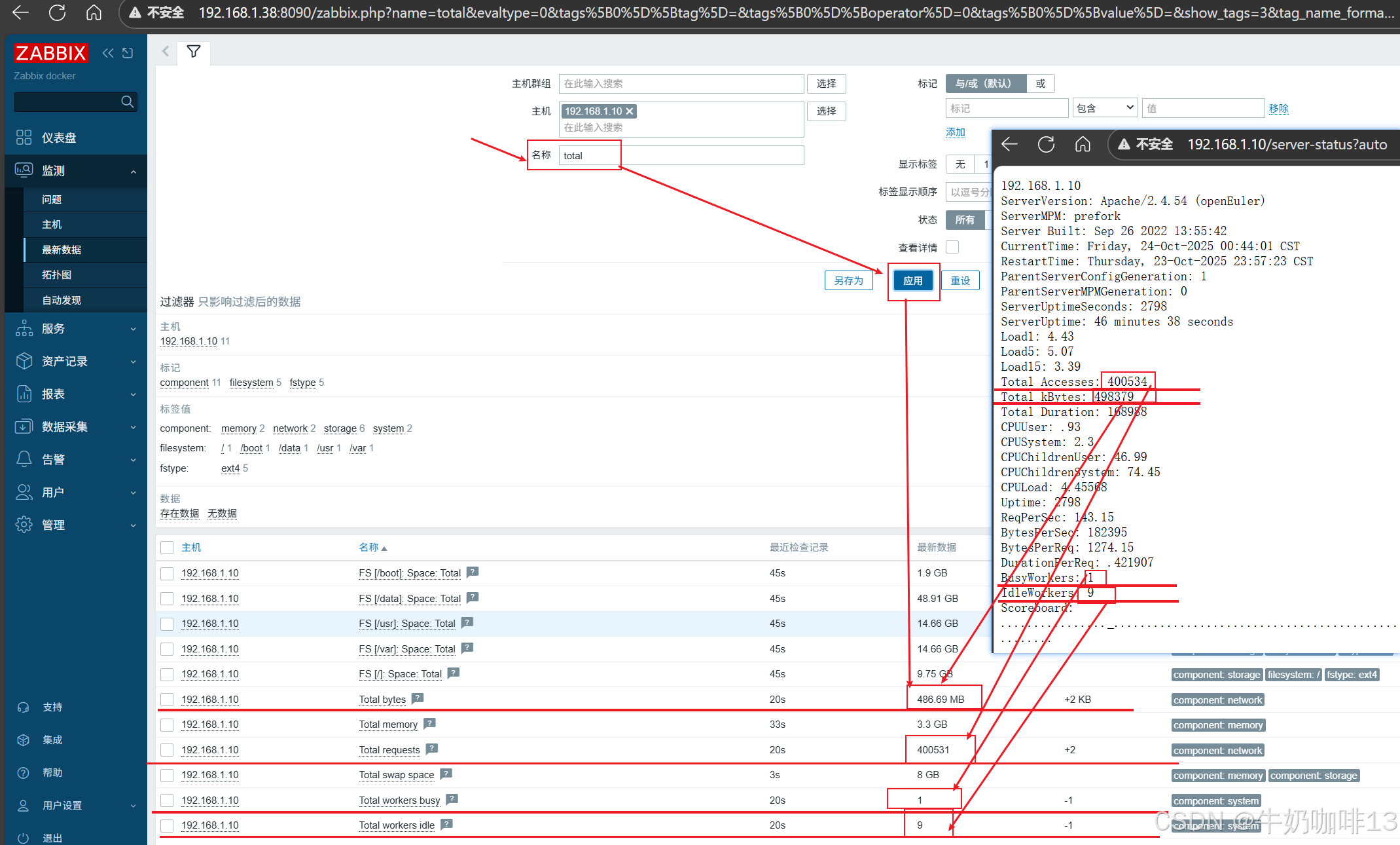 《3》监测给Apache服务所在主机配置的Apache监测模板数据是否采集到进行监控(即:打开zabbix的web界面左侧的导航栏【监测】-->【主机】-->选择安装了Apache服务的主机(如:192.168.1.10)-->【最新数据】-->使用【名称】过滤Total)