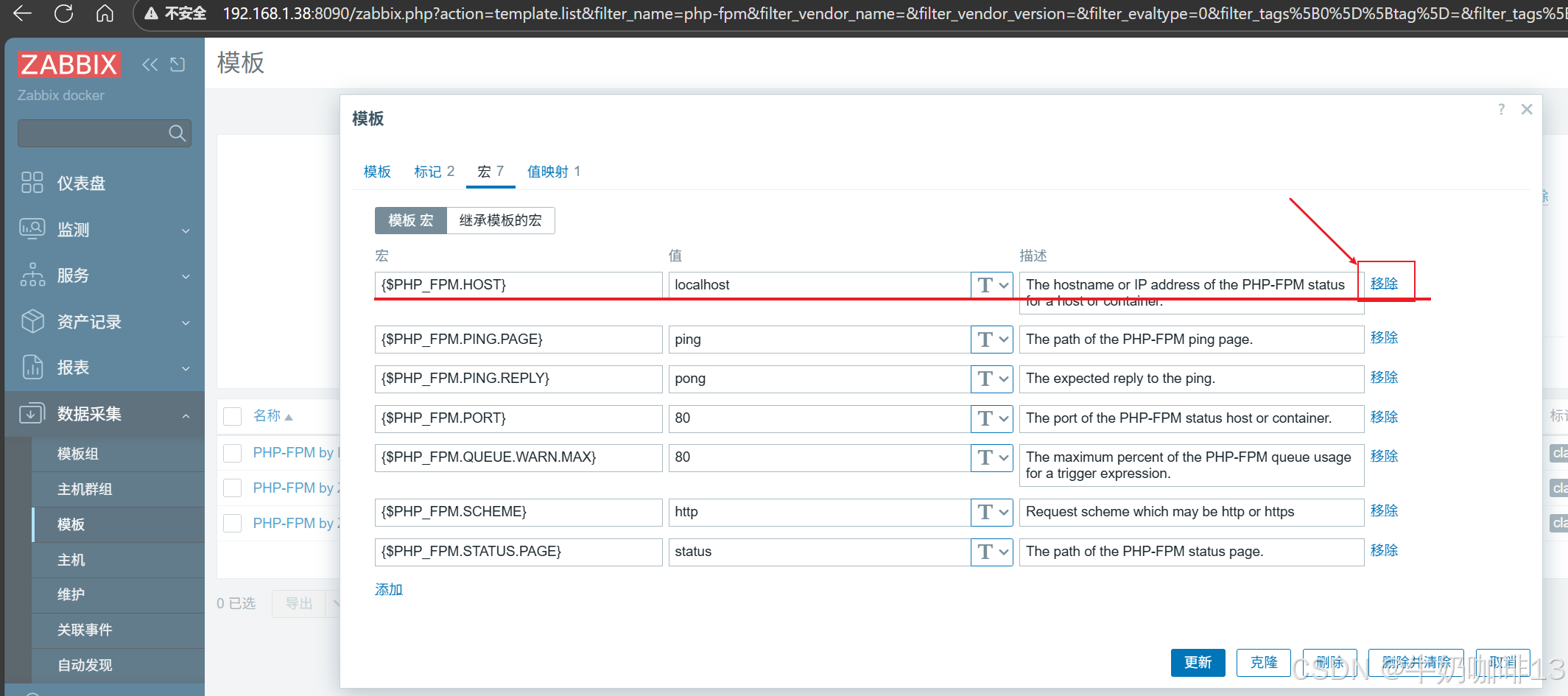 《1》打开zabbix的web界面左侧的导航栏【数据采集】-->【模板】-->在模板界面顶部的【名称】输入框中输入php-fpm后点击-->【应用】即可过滤出所有php-fpm的相关模板;我们这里就选择模板【PHP-FPM by HTTP】(可以不用安装zabbix-agent2就直接使用)打开-->选择【宏】需要将【{$PHP_FPM.HOST}】这个主机删除掉,因为是通过HTTP协议连接通讯,要实现该模板通用就不能使用指定的主机IP;接下来会修改涉及到原来使用【{$PHP_FPM.HOST}】宏变量的监控项实现为自动获取主机IP连接(