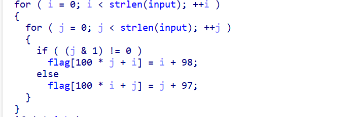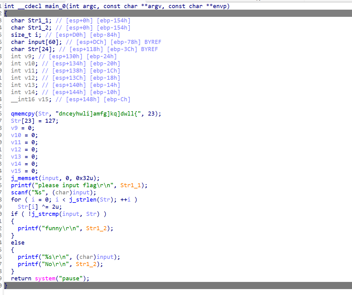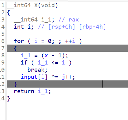 {__int64 result; // raxint v1; // [rsp+Ch] [rbp-4h]v1 = 1;x1 = j;while ( 1 ){result = (len - 1);if ( result == v1 )break;input[v1] ^= x1;--input[v1++];}return result;