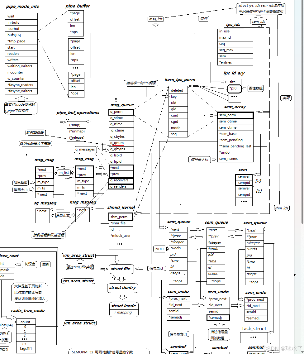 在内核中,有一个 struct ipc_ids sem_ids 结构体,里面包含了一指针 *entries,指向一个 ipc_id_ary 结构体,而 ipc_id_ary 结构体中维护了一个柔性数组,数组的每一个元素存储着指向上述申请的各种资源的指针。
