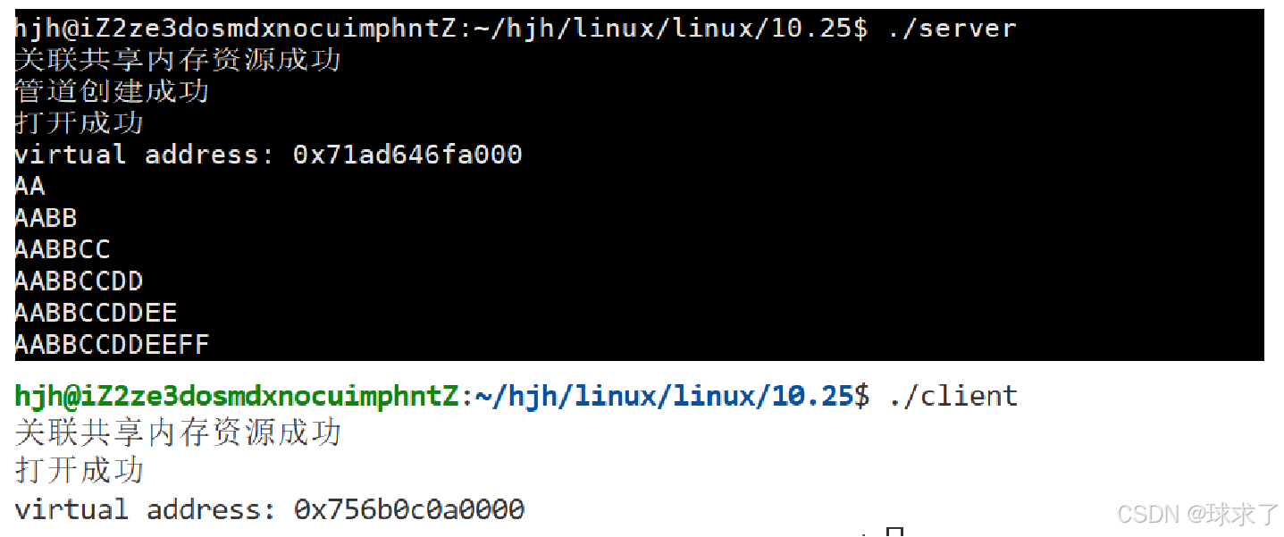 上述代码分为服务端和客户端。当服务端启动的时候,创建共享内存并将共享内存和该进程进行关联,创建命名管道并以读方式打开命名管道,此时服务端进程会阻塞在Wait()函数的read()函数处,等待客户端启动;当客户端启动时,获取和服务端相同的共享内存资源并关联该共享内存,并且以写方式打开命名管道,然后向共享内存中依次写入AA BB CC ...,当同一个字母写了两次后,向命名管道中写入一个标记字符c,唤醒服务端,服务端收到该进程发送的标记字符,结束等待,从共享内存资源中读取数据。