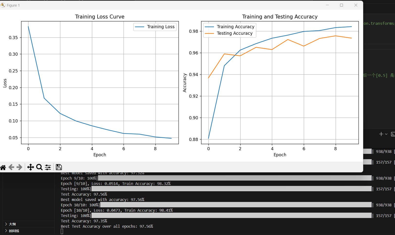 best_model_path = 'best_model.pth' # 保存最佳模型的路径for epoch in range(num_epochs):running_loss = 0.0 # 累计本轮的损失correct_train = 0 # 训练集上正确预测的样本数total_train = 0 # 训练集上总样本数model.train() # 设置模型为训练模式# 用tqdm显示进度条(desc参数设置进度条前缀),遍历训练集中的每一批数据for images, labels in tqdm(train_loader, desc=f'Epoch {epoch+1}/{num_epochs}'):images, labels = images.to(device), labels.to(device) # 将数据移动到指定设备optimizer.zero_grad() # 清零梯度outputs = model(images) # 前向传播,模型对图片做预测loss = criterion(outputs, labels)# 计算损失loss.backward() # 反向传播optimizer.step() # 更新参数running_loss += loss.item() # 累计损失_, predicted = torch.max(outputs, 1) # 获取预测结果(_为最大值,predicted取最大值索引即预测数字),模型输出的二维张量格式是【batch_size,类别维度】,取1代表类别维度(概率)total_train += labels.size(0) # 累计样本数correct_train += (predicted == labels).sum().item() # 累计正确预测数# 计算训练集上的准确率train_accuracy = correct_train / total_traintrain_losses.append(running_loss / len(train_loader)) # 计算并保存本轮的平均损失train_accuracies.append(train_accuracy)print(f'Epoch [{epoch+1}/{num_epochs}], Loss: {running_loss/len(train_loader):.4f}, Train Accuracy: {train_accuracy*100:.2f}%')# 训练完一轮后,在测试集上评估模型model.eval() # 设置模型为评估模式correct_test = 0 # 测试集上正确预测的样本数total_test = 0 # 测试集上总样本数with torch.no_grad(): # 评估时不计算梯度for images, labels in tqdm(test_loader, desc='Testing'):images, labels = images.to(device), labels.to(device)outputs = model(images)_, predicted = torch.max(outputs, 1)total_test += labels.size(0)correct_test += (predicted == labels).sum().item()test_accuracy = correct_test / total_test # 计算测试集上的准确率test_accuracies.append(test_accuracy)print(f'Test Accuracy: {test_accuracy*100:.2f}%')# 保存最佳模型if test_accuracy > best_accuracy:best_accuracy = test_accuracytorch.save(model.state_dict(), best_model_path) # 保存模型参数(权重和偏置)print(f'Best model saved with accuracy: {best_accuracy*100:.2f}%')print(f'Best Test Accuracy over all epochs: {best_accuracy*100:.2f}%')# 绘制损失曲线
