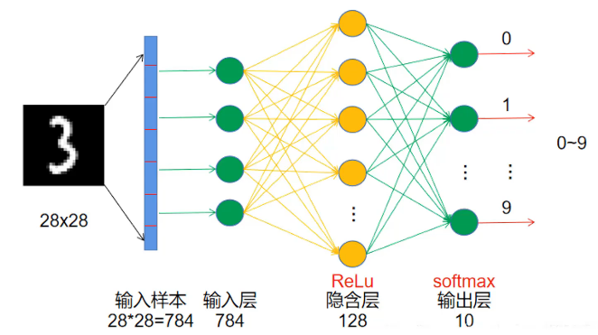 输入层是展平的神经元,前向传播,通过线性变换,相加求和得到隐藏层。再通过ReLu增加非线性,隐藏层神经元可自定义,层数也自定义。输出层通过softmax计算概率,再与真实值比较,计算损失Loss,再反向传播,计算梯度,跟新线性变换的参数。