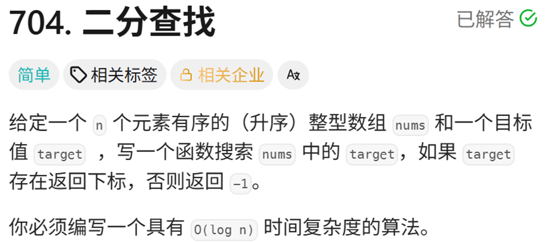 int search(int* nums, int numsSize, int target) {int left=0,right=numsSize-1,mid;while(left<=right){mid=left+(right-left)/2;if(nums[mid]==target) return mid;if(nums[mid]>target){right=mid-1;}else{left=mid+1;}}return -1;