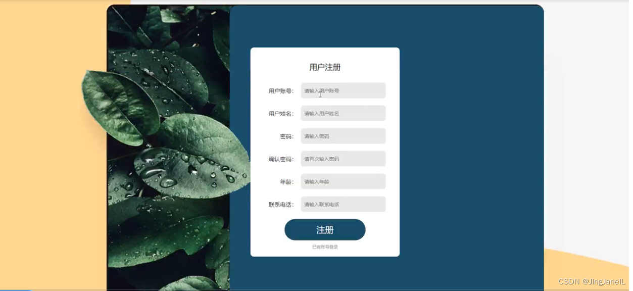 用户注册,在用户注册页面通过填写,用户账号、用户姓名、密码、确认密码、年龄、联系电话等内容进行注册等操作等信息进行注册操作,如图5-2所示。
